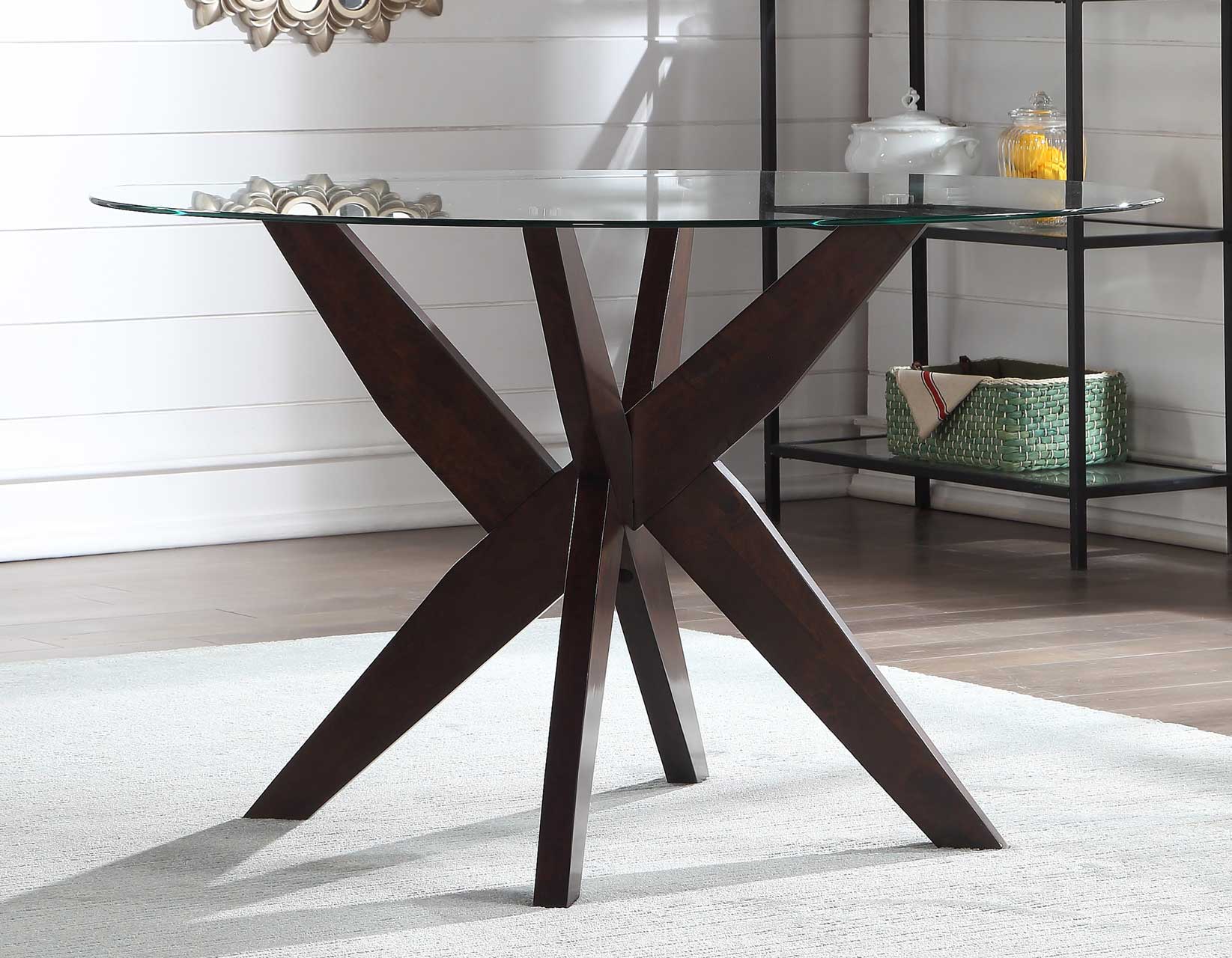 • Constructed of hardwood solids in a walnut color finish with round glass table top