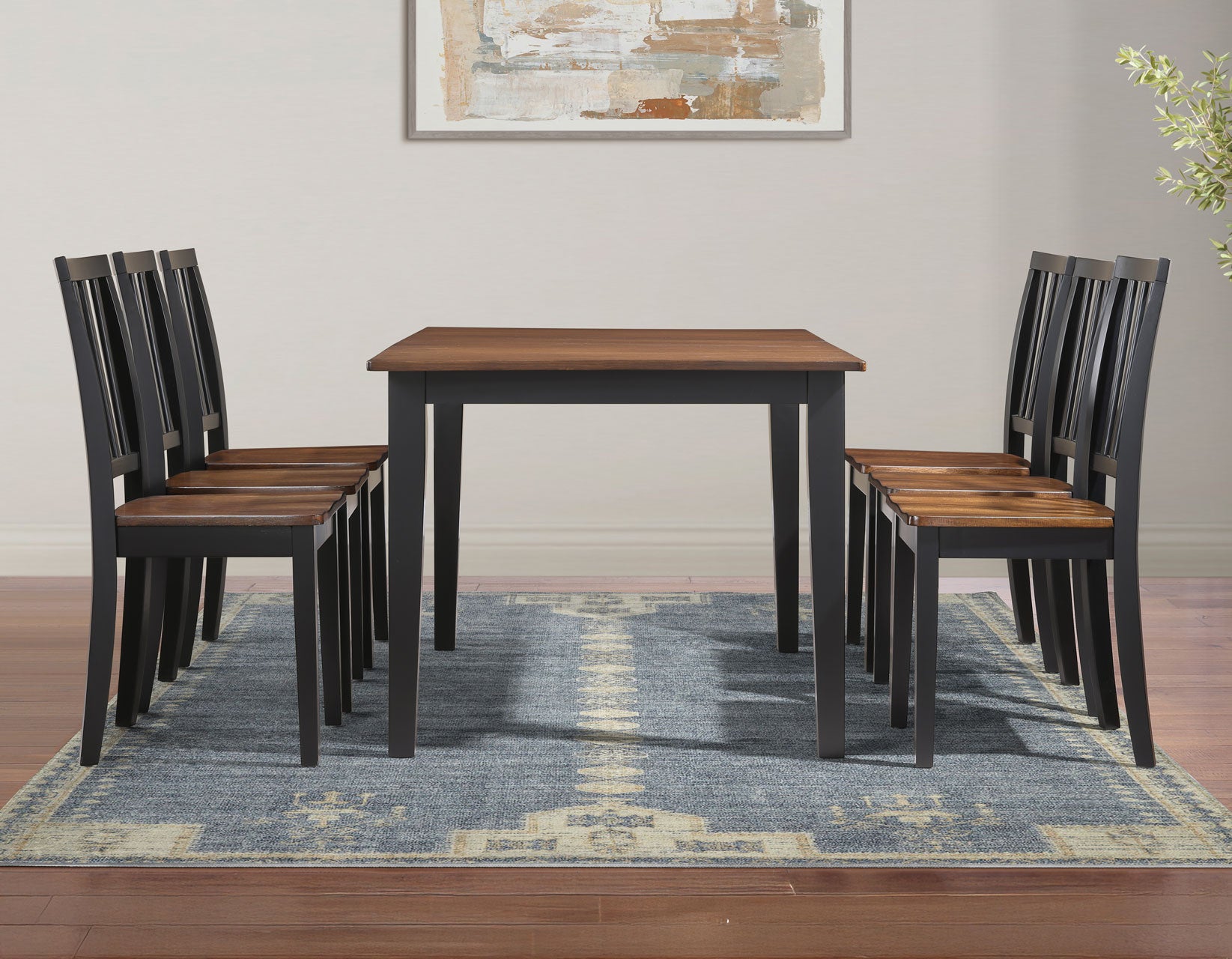 The Joplin Walnut and Ebony Dining Room Set combines timeless farmhouse charm with modern versatility. The 50-62″ dining table features a rich walnut veneer top, ebony-finished solid wood legs, and concave edges for added style. A 12″ leaf expands the table to seat six comfortably. Paired with four schoolhouse-inspired side chairs, finished in coordinating walnut and ebony tones, each scooped seat offers comfort while solid wood construction ensures lasting durability. Perfect for dining rooms or cozy spaces, Joplin delivers warmth, strength, and classic appeal. Discover more timeless and versatile furniture for your home at Luna Furniture.