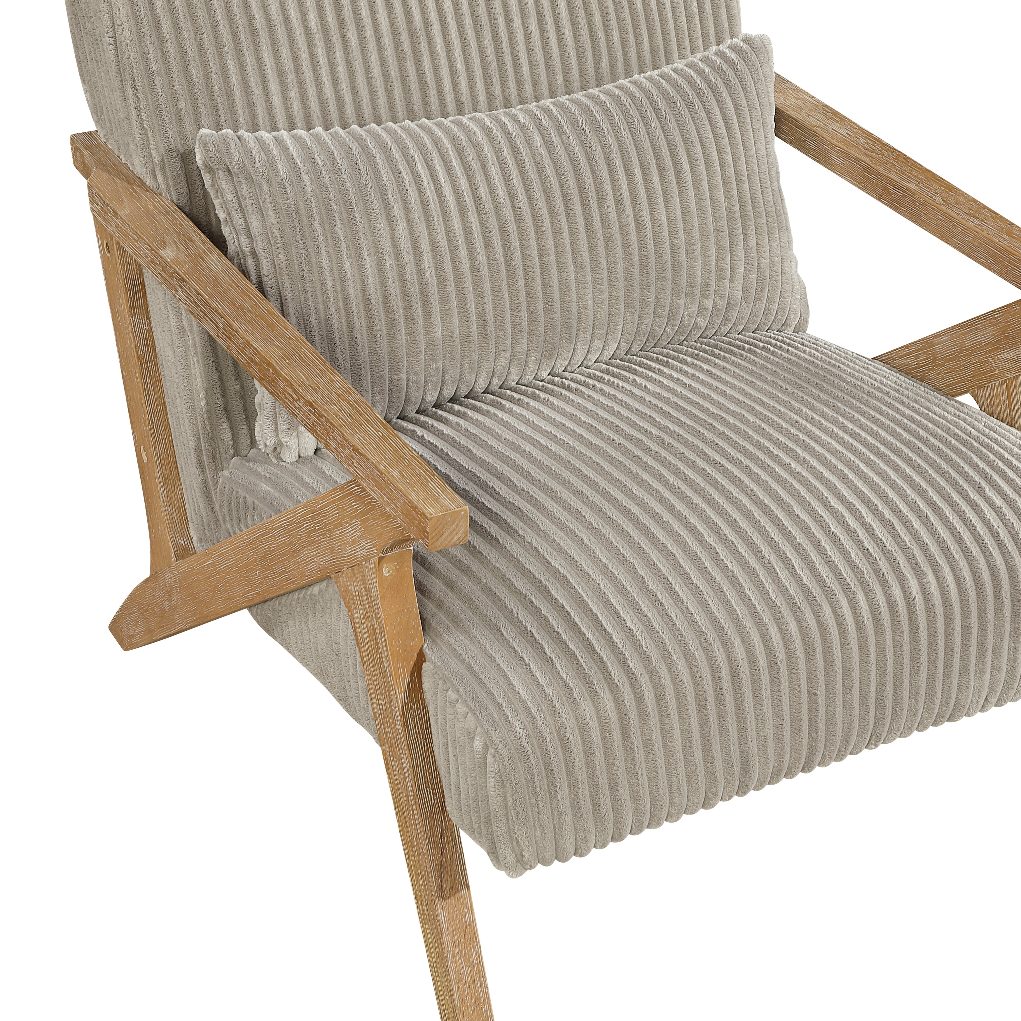 Enhance your living space with this stylish and comfortable accent chair, blending modern design with natural warmth. Upholstered in a soft, cozy corduroy fabric, the chair is available in beige, black, taupe, and gray. The sturdy frame is crafted from solid rubberwood with a beautiful natural, weathered finish. One matching pillow is included to complete the look, making this chair an elegant and ready-to-enjoy addition to any room.