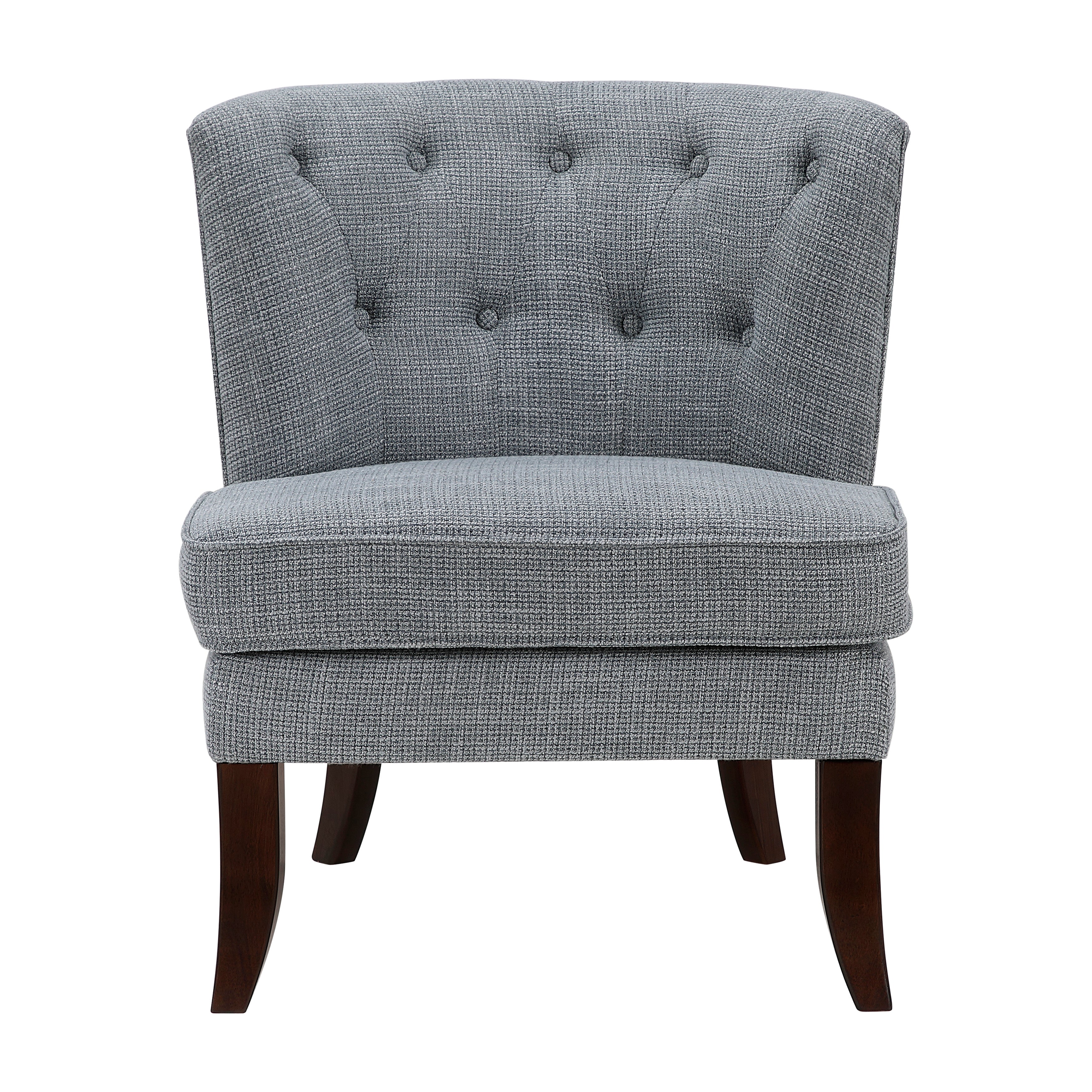 Add a touch of classic elegance to your home with this beautifully tufted accent chair. Featuring a traditional silhouette and delicate button tufting, this chair exudes sophistication and charm. The soft, textured dark gray fabric upholstery complements a variety of interior styles, while the generously cushioned seat provides exceptional comfort. Sturdy dark wood legs add a touch of contrast and stability, making this chair a perfect addition to your living room, bedroom, entryway, or dining area. Enhance your space with this versatile and stylish accent piece that seamlessly blends timeless design with modern comfort.