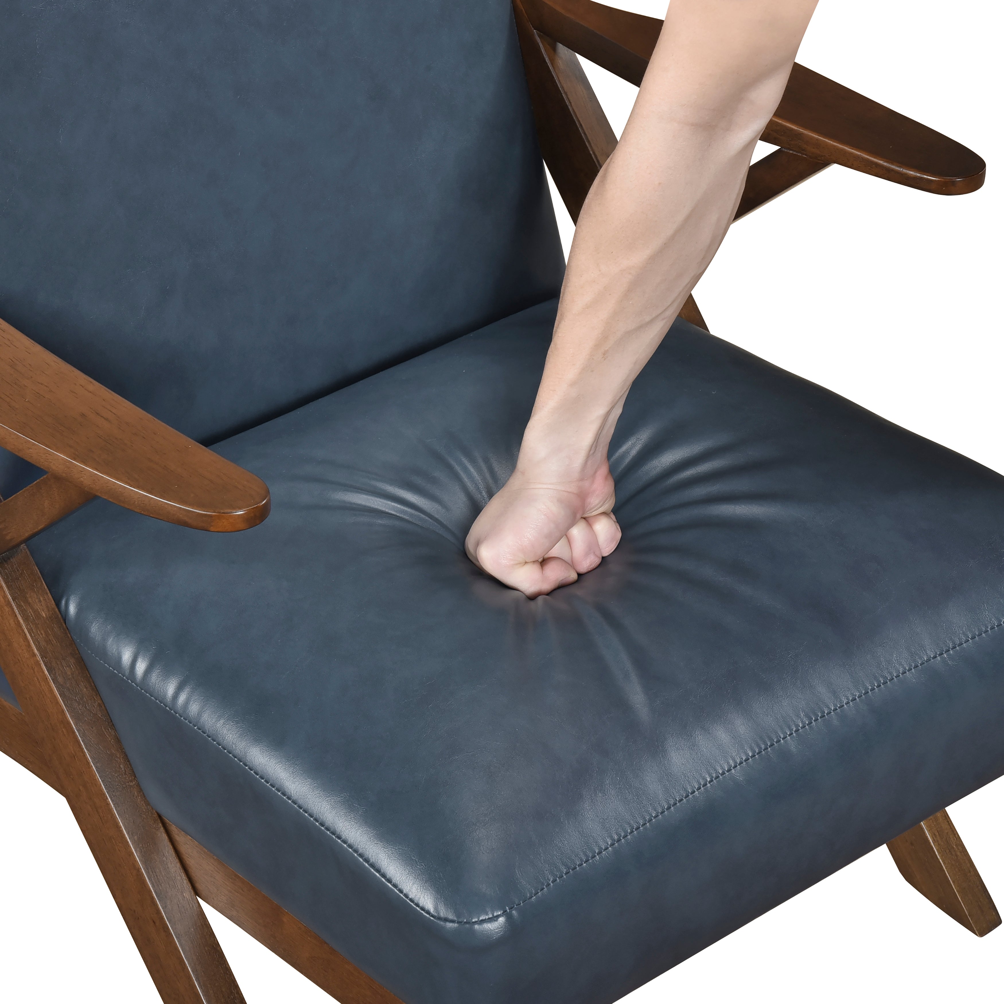 Add a touch of retro sophistication to your living space with this Mid-Century Modern Wood Arm Accent Chair. Featuring a distinctive design with angular wooden arms and a warm walnut finish, this chair brings a classic yet contemporary feel to any room. The supple blue leatherette upholstery offers a luxurious look and feel, while the generously cushioned seat and back provide exceptional comfort. Perfect for creating a stylish reading nook, adding a statement piece to your living room, or enhancing your office décor, this chair effortlessly blends vintage charm with modern comfort.