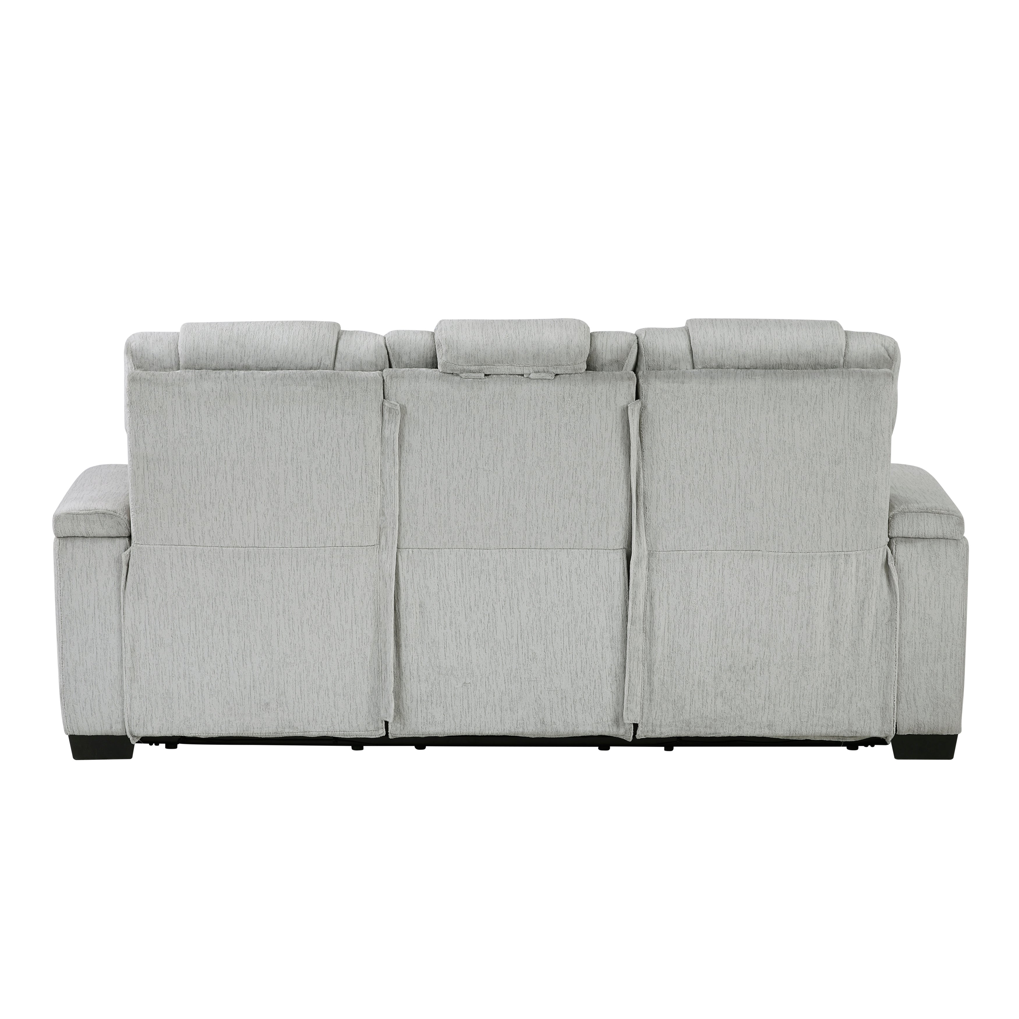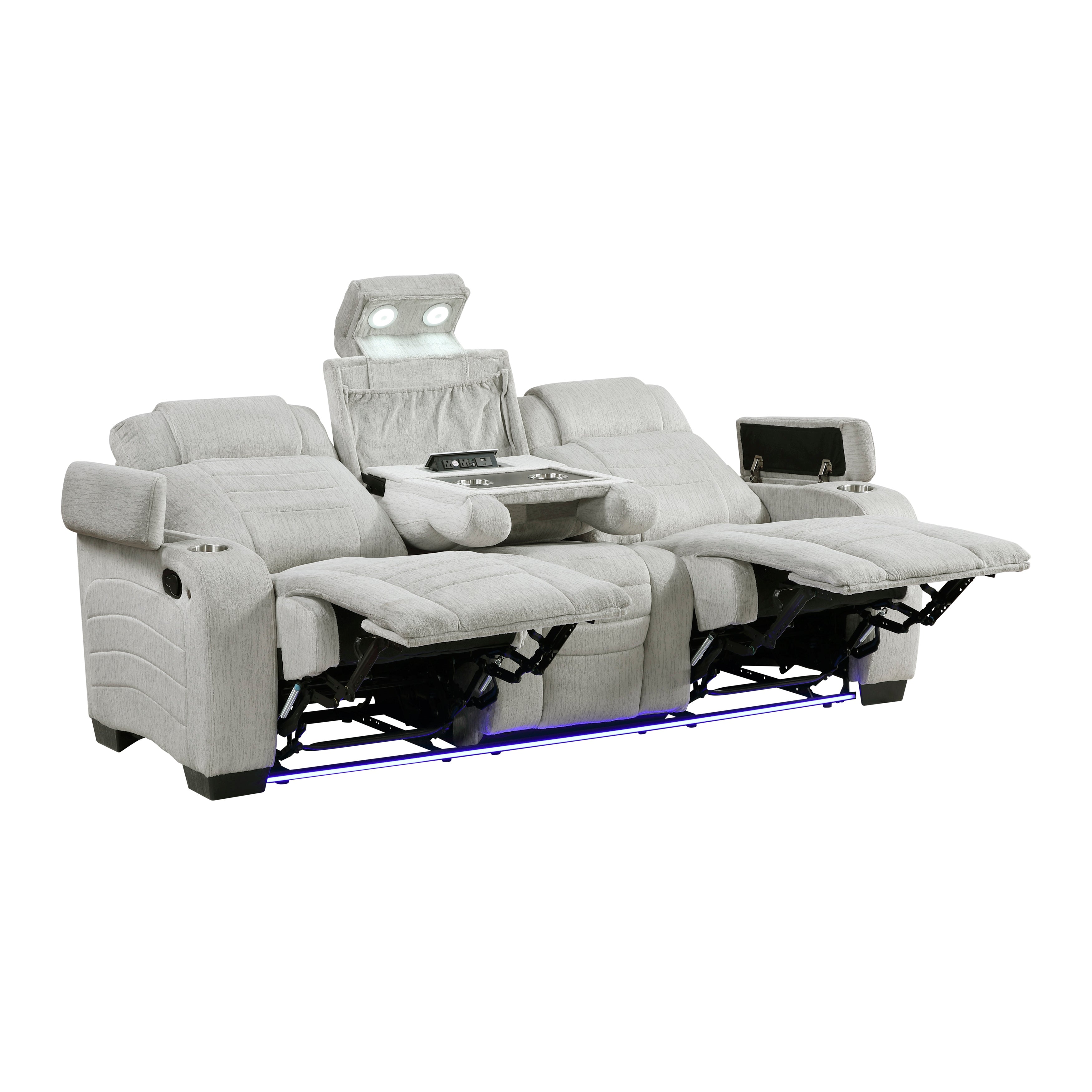 Experience the ultimate in home entertainment and comfort with the double reclining sofa, thoughtfully designed for shared relaxation and modern convenience. Upholstered in a soft and durable textured microfiber, this sofa features two pull tab reclining mechanisms, allowing each to find their perfect lounging position. The innovative drop-down center table transforms this sofa into an entertainment hub, complete with LED lighting, dual cup holders, a handy magazine pocket, and the essential power outlets and USB charging ports to keep your devices ready. Enjoy additional features like hidden armrest storage, integrated cup holders on the outer seats, and ambient LED lighting along the base, all built upon a sturdy solid wood and plywood frame with metal-reinforced seats for lasting durability and support up to 300lbs per seat.