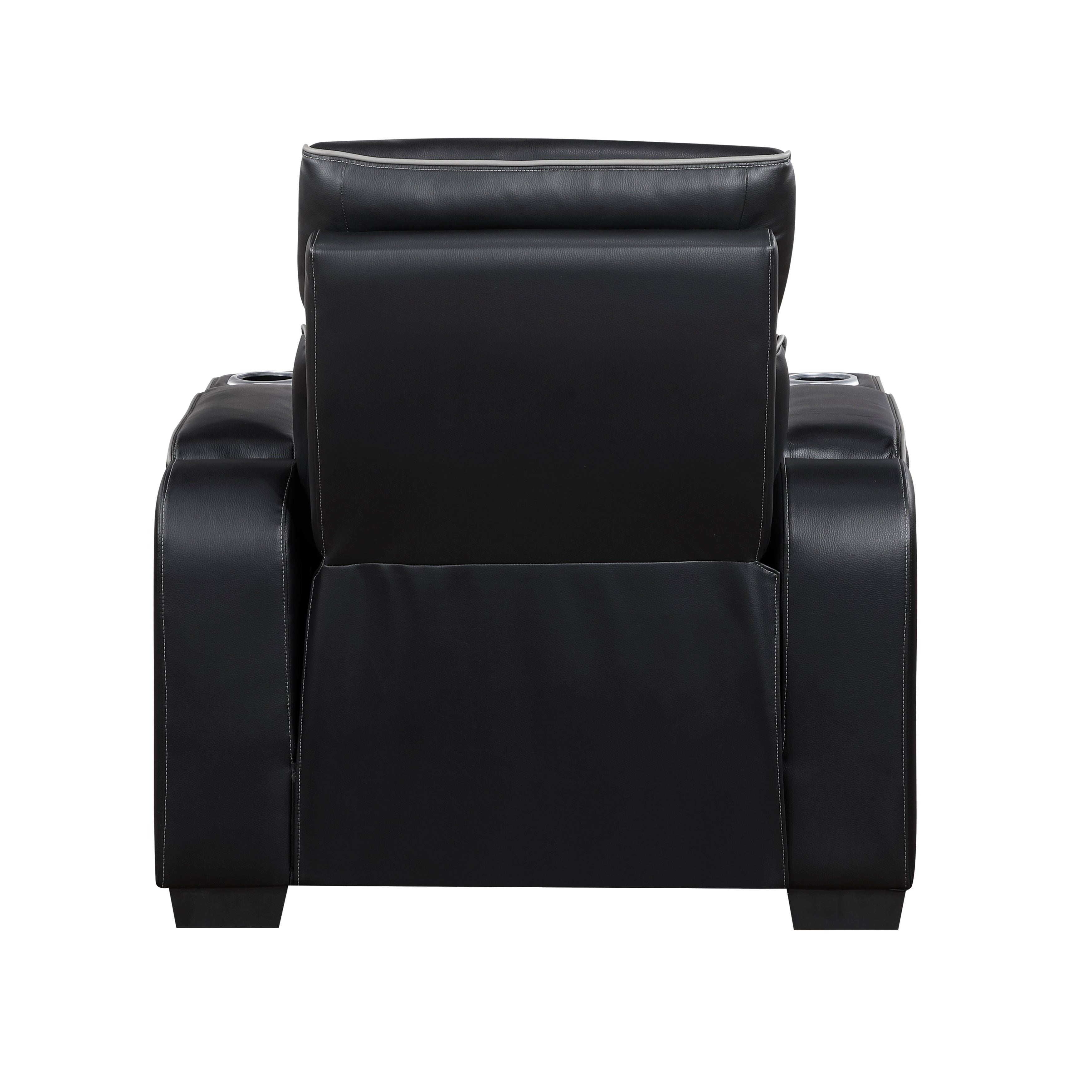 Experience the ultimate in relaxation and convenience with this breathable faux leather power recliner. This state-of-the-art recliner is designed to provide unparalleled comfort with features like power reclining, an adjustable power headrest, and ambient LED lighting. Enjoy your favorite beverages with built-in cup holders, keep your devices charged with USB ports, and store essentials in the top and side storage arms. The sleek black faux leather upholstery with diamond-stitched detailing adds a touch of modern sophistication, making this recliner a perfect addition to your home theater, living room, or personal relaxation space.