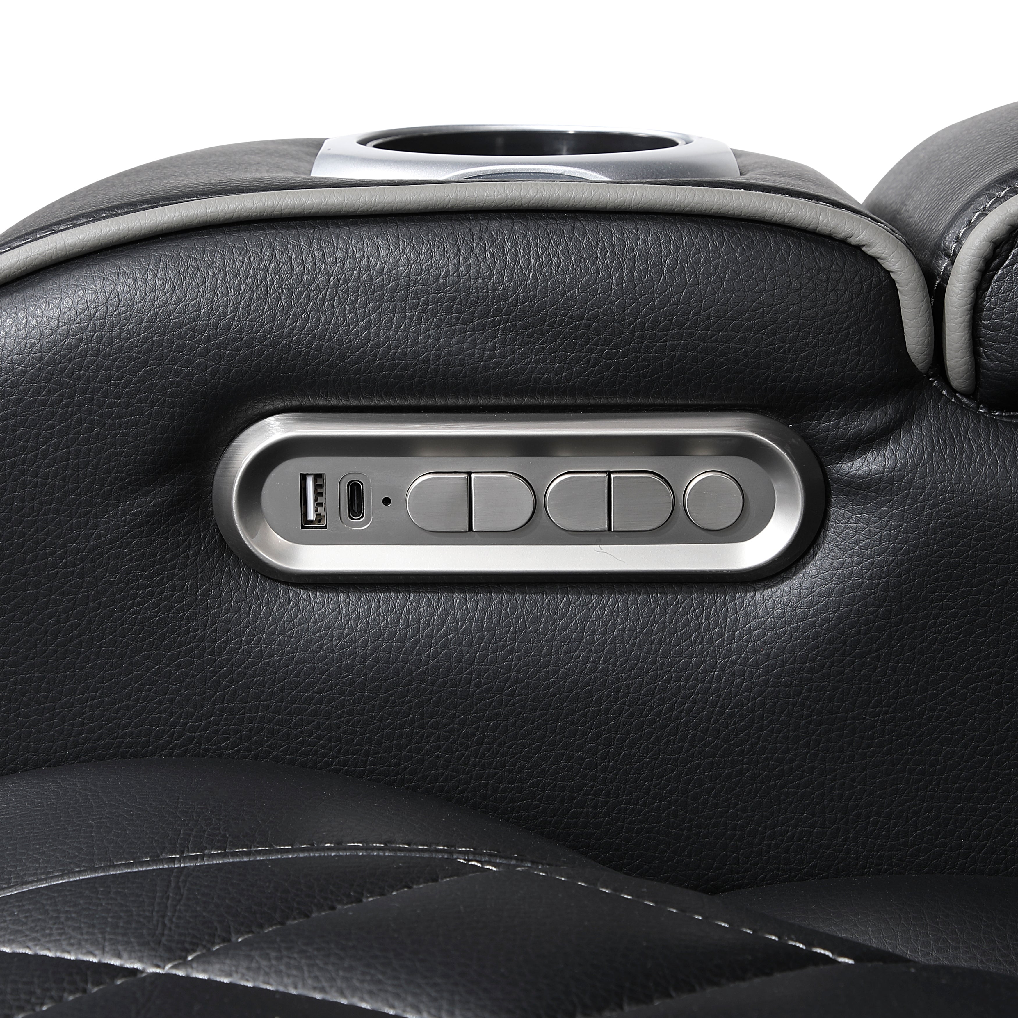 Experience the pinnacle of home theater luxury with this black faux leather power double reclining sofa. Designed for ultimate comfort and convenience, this sofa features independent power reclining and adjustable power headrests, allowing each person to find their perfect position. The center drop-down console reveals cup holders and reading lights, while two wireless charging pads and USB ports keep your devices powered. Top and side storage arms provide ample space for remotes and other essentials. Ambient LED lighting adds a touch of modern sophistication. The sleek black faux leather upholstery with diamond-stitched detailing ensures both durability and style, making this sofa the perfect centerpiece for your entertainment space.