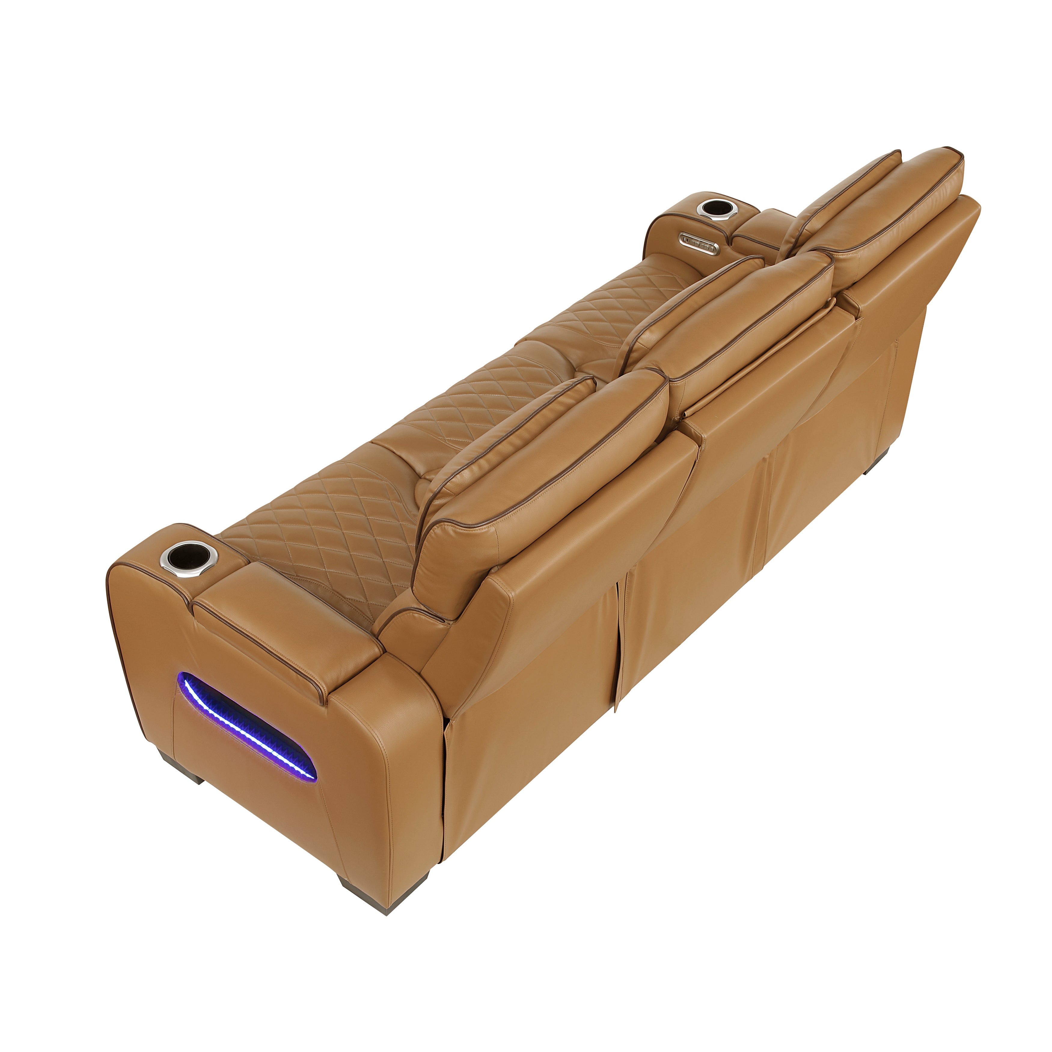 Experience the pinnacle of home theater luxury with this tan faux leather power double reclining sofa. Designed for ultimate comfort and convenience, this sofa features independent power reclining and adjustable power headrests, allowing each person to find their perfect position. The center drop-down console reveals cup holders and reading lights, while two wireless charging pads and USB ports keep your devices powered. Top and side storage arms provide ample space for remotes and other essentials. Ambient LED lighting adds a touch of modern sophistication. The warm tan faux leather upholstery with diamond-stitched detailing ensures both durability and style, making this sofa the perfect centerpiece for your entertainment space.