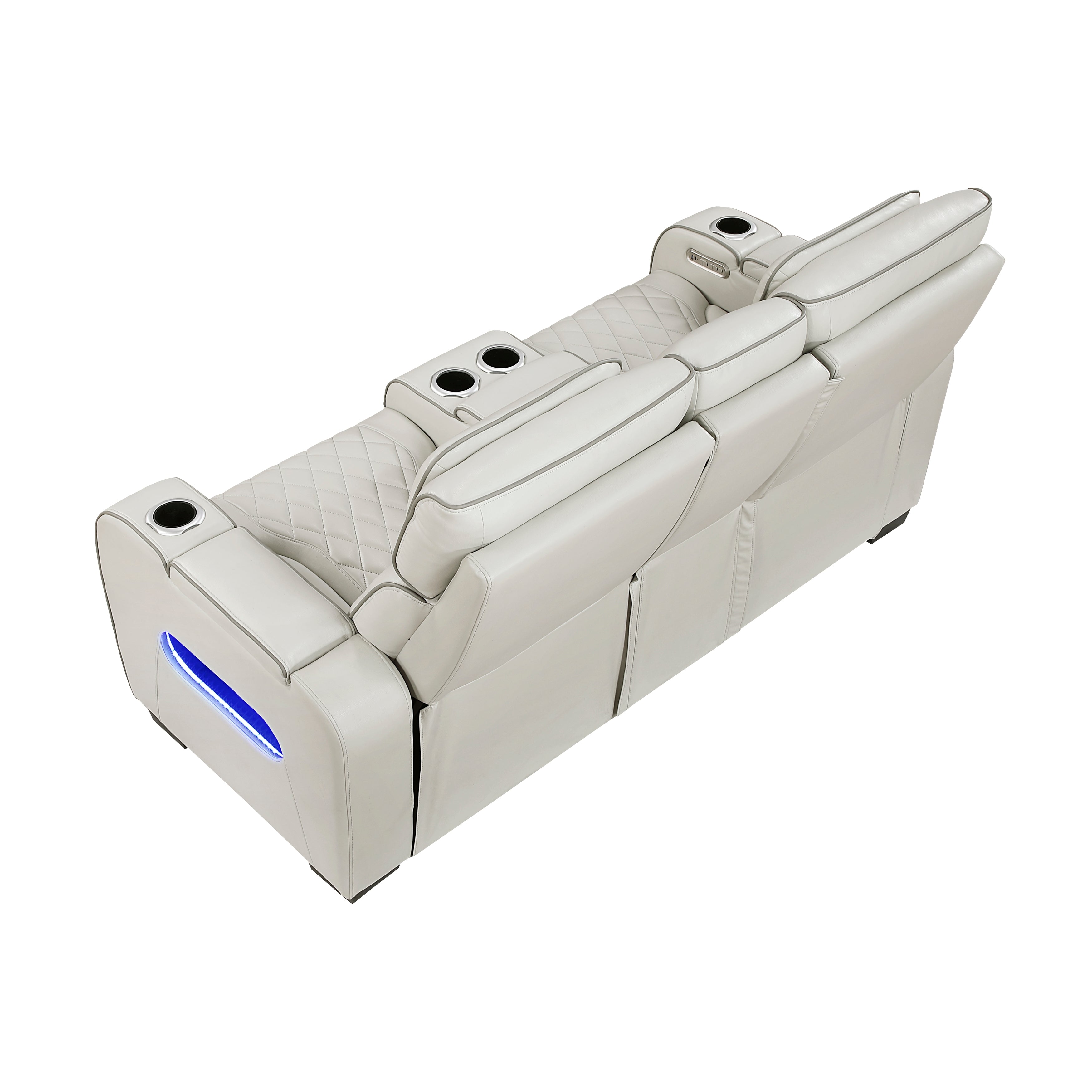 Experience unparalleled comfort and convenience with this light taupe faux leather power double reclining loveseat. This luxurious loveseat is designed for ultimate relaxation with features like independent power reclining, adjustable power headrests, and ambient LED lighting. The center console provides storage and cup holders for added convenience, while built-in USB ports keep your devices charged. Top and side storage arms offer additional storage space for remotes or other essentials. The light taupe faux leather upholstery with diamond-stitched detailing adds a touch of modern sophistication, making this loveseat a perfect centerpiece for your home theater or living room.