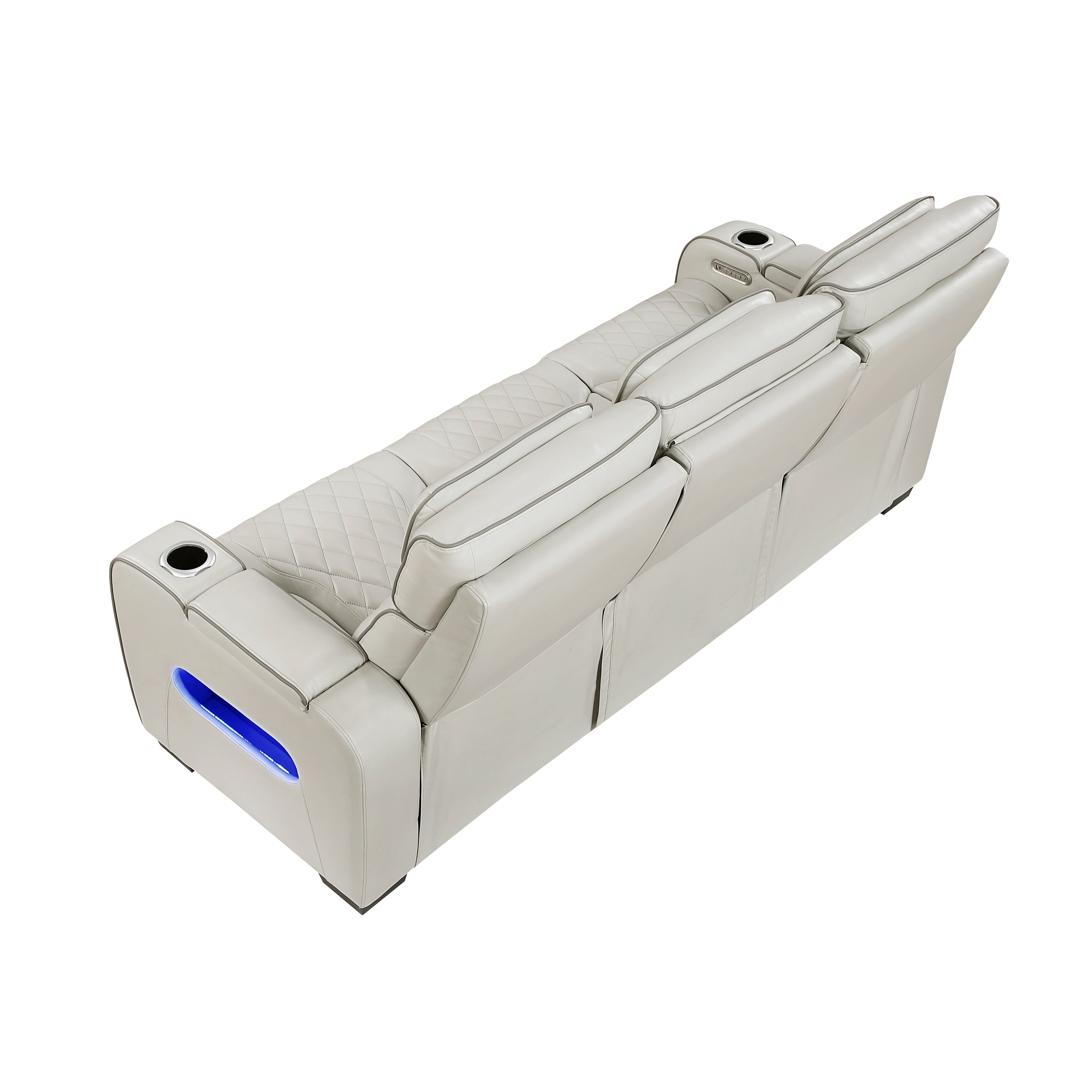 Experience the pinnacle of home theater luxury with this light taupe faux leather power double reclining sofa. Designed for ultimate comfort and convenience, this sofa features independent power reclining and adjustable power headrests, allowing each person to find their perfect position. The center drop-down console reveals cup holders and reading lights, while two wireless charging pads and USB ports keep your devices powered. Top and side storage arms provide ample space for remotes and other essentials. Ambient LED lighting adds a touch of modern sophistication. The light taupe faux leather upholstery with diamond-stitched detailing ensures both durability and style, making this sofa the perfect centerpiece for your entertainment space.