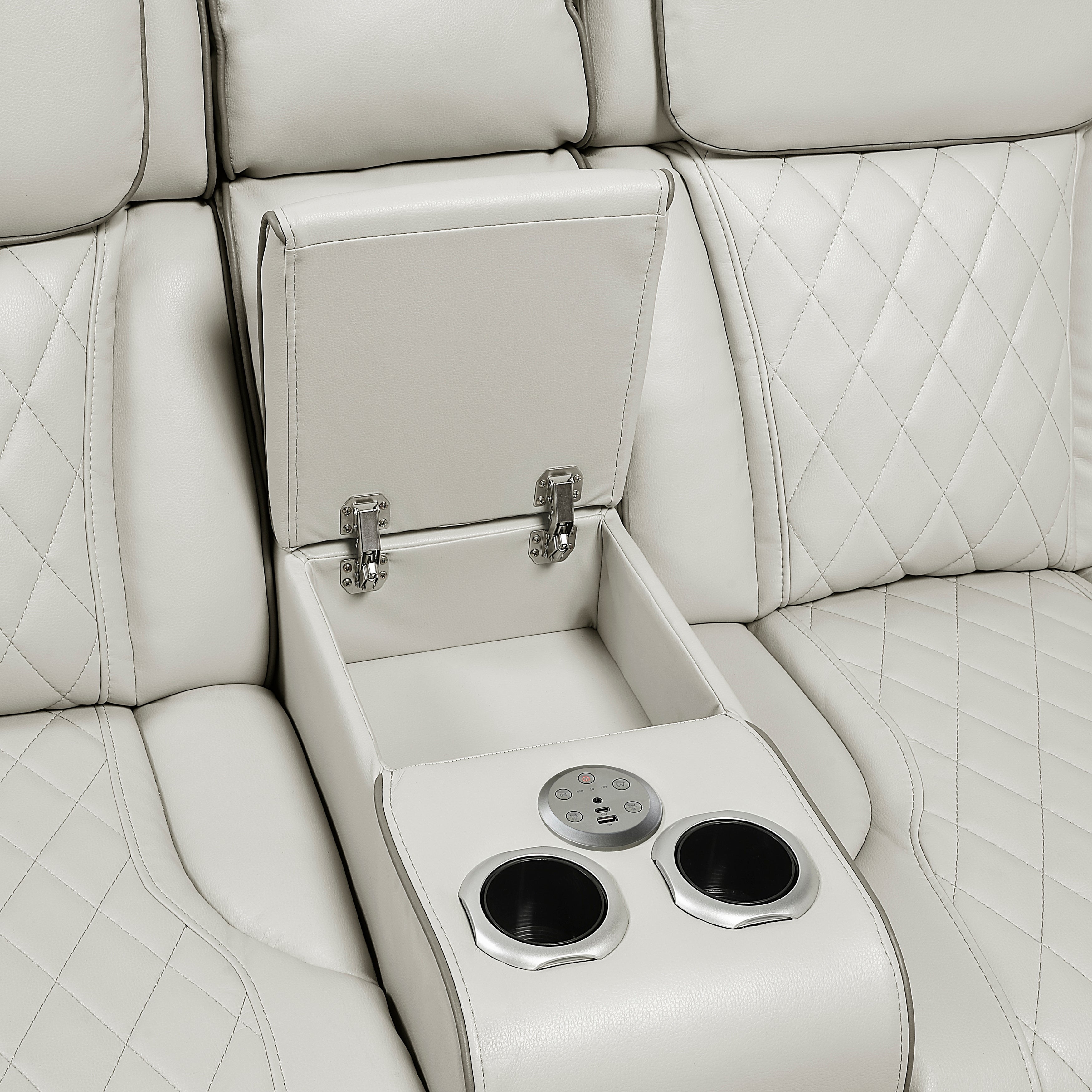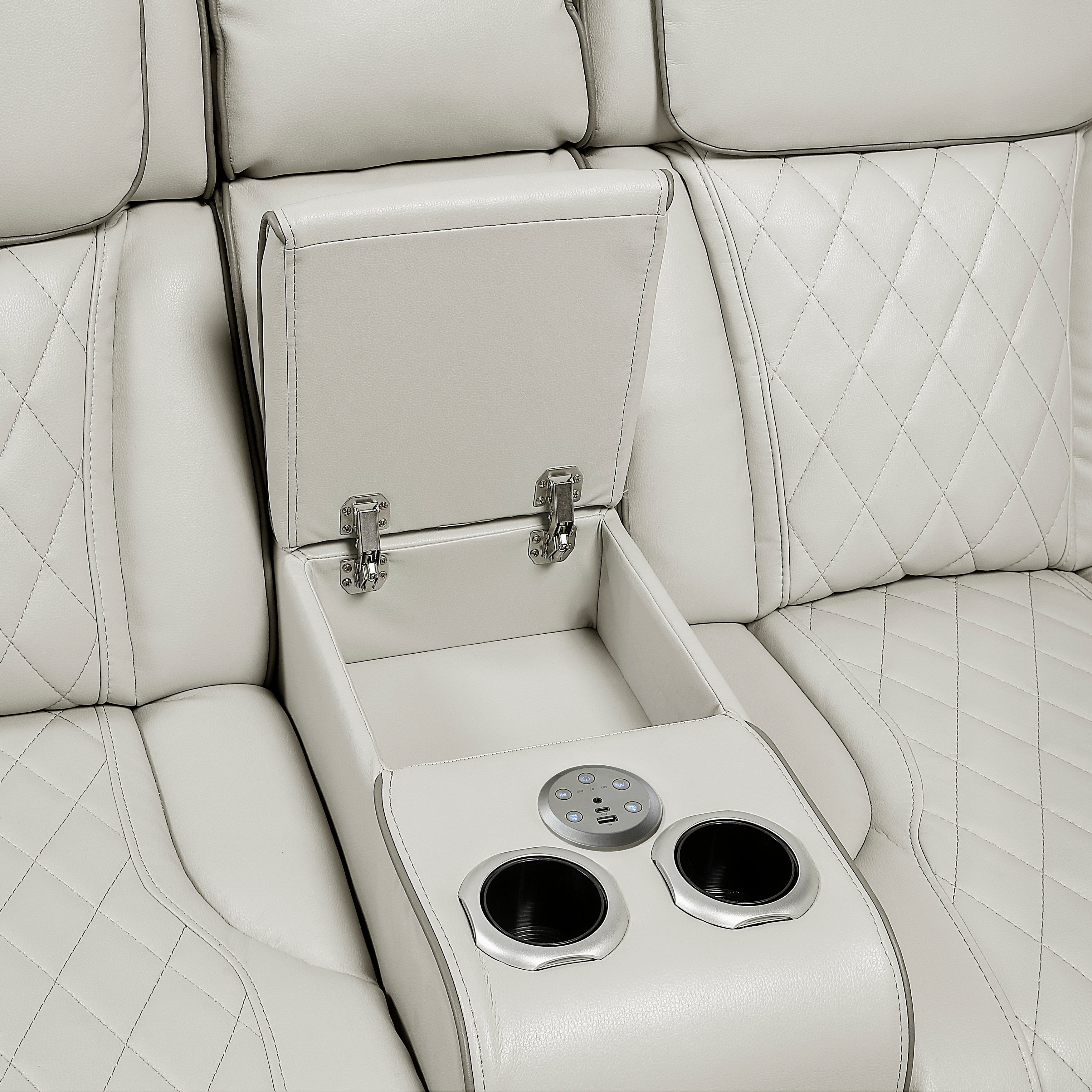 - Love seat console with hidden storage, USB-A & C charging ports, cup holders and wireless speakers
