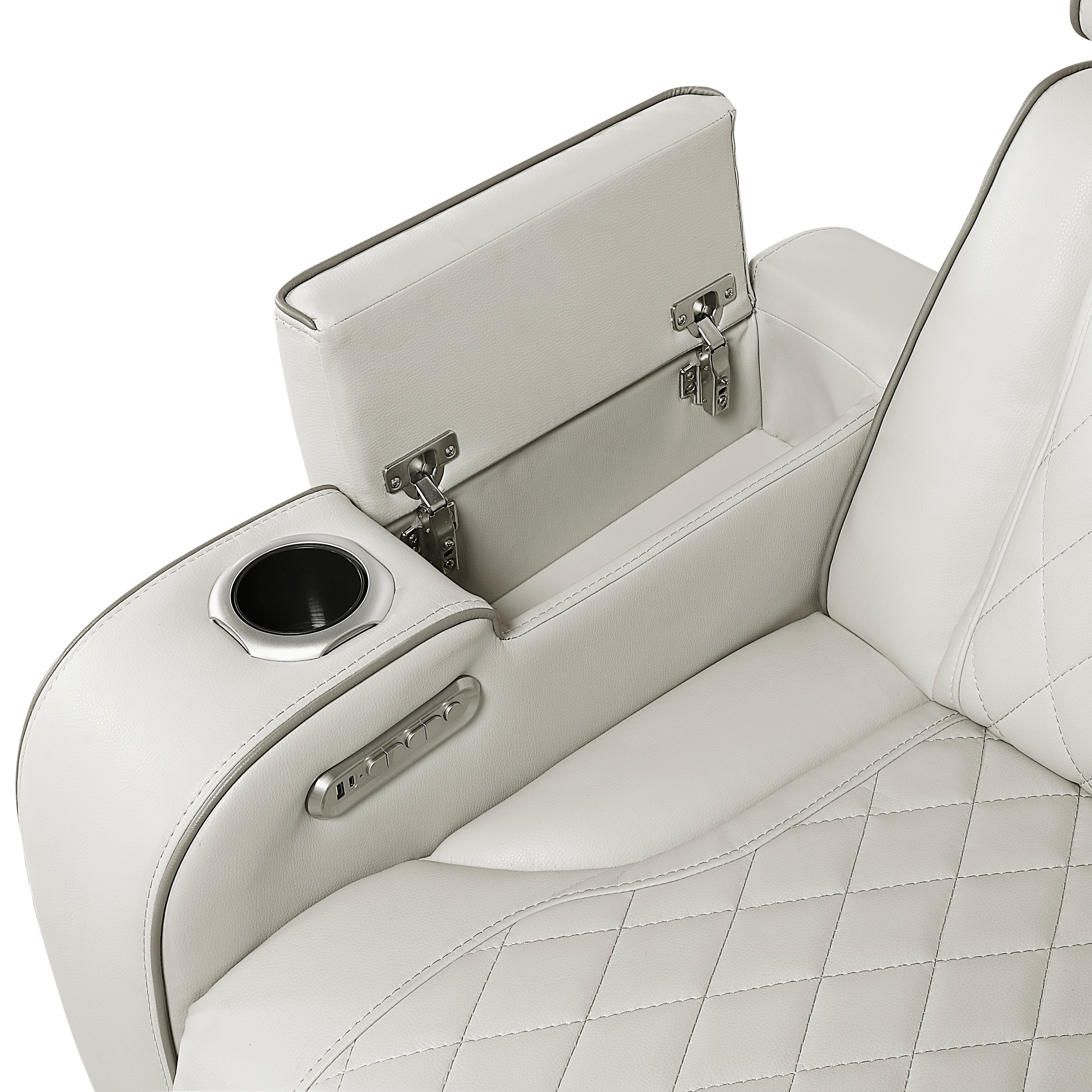 - Armrests with storage, USB-A & C charging ports and cup holders