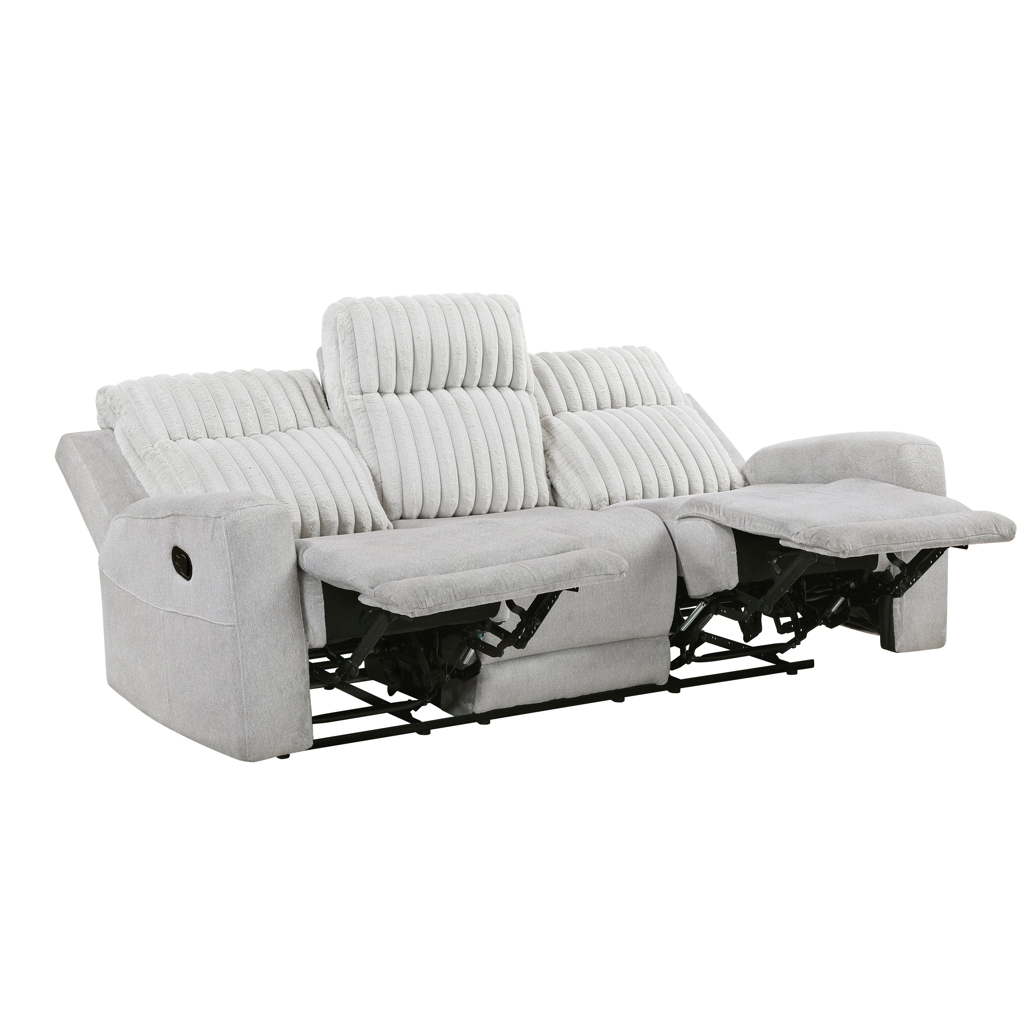 Experience shared comfort and individual relaxation with this two-tone gray double reclining sofa, featuring a unique blend of textured microfiber and cozy corduroy fabrics. Built with a robust solid wood and plywood frame, metal reinforced seats, and foam padding over pocket coils, this sofa offers both durability and exceptional support. The independent tab pull reclining mechanisms allow each person to recline to their desired position. With a 300lb weight capacity per seat (900lb total), this sofa is perfect for enhancing your living room or entertainment space with a blend of modern design and luxurious comfort.