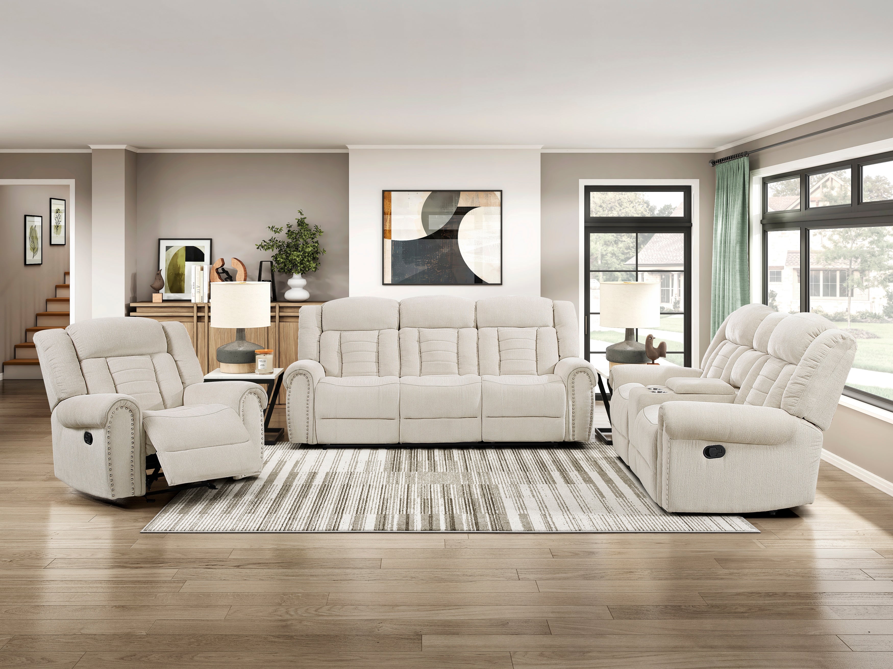 Experience shared comfort and classic style with our chenille fabric double recliner loveseat. Upholstered in soft, inviting chenille, this loveseat offers a warm and welcoming feel to any living space. Each seat features an easy-to-use tab pull reclining motion, allowing both you and your partner to effortlessly find your ideal lounging position. The convenient center storage console, complete with two cup holders, keeps your essentials within reach. Elegant nailhead trim accents the design, adding a touch of sophistication. Built with a solid wood and plywood frame, metal reinforced seat, and foam padding over pocket coils, this loveseat ensures durability and support for up to 300lbs per seat.