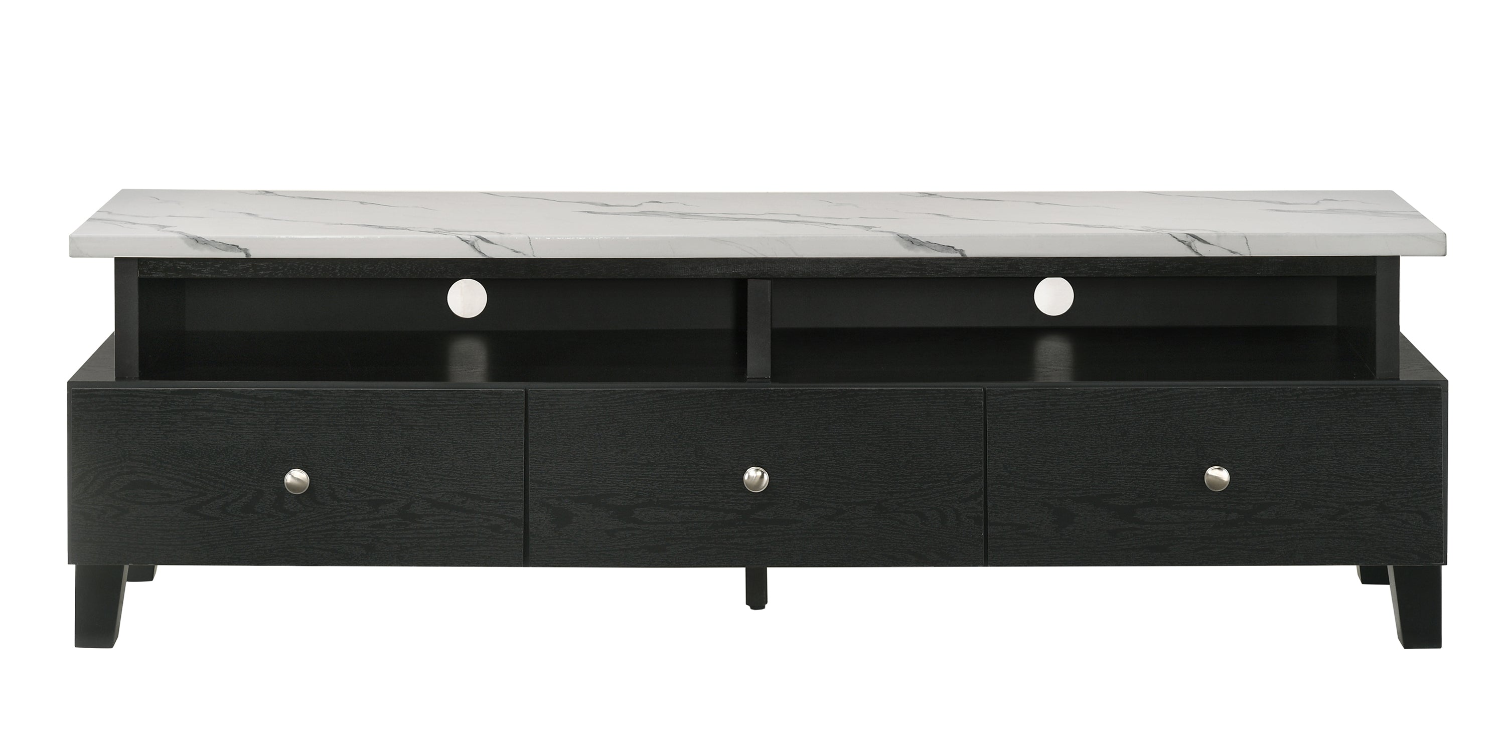 Embrace modern sophistication and functionality with this stunning entertainment console, designed to be the centerpiece of any contemporary living space. Featuring a sleek dark finish with an elegant faux marble top, this piece combines luxury and practicality. The robust construction ensures durability while providing ample storage for all your media needs. It offers generous shelving spaces and smooth-gliding drawers accented with chic, minimalist handles. Elevated on sturdy block legs, this console not only enhances the visual space of your room but also keeps your entertainment area tidy and stylish.