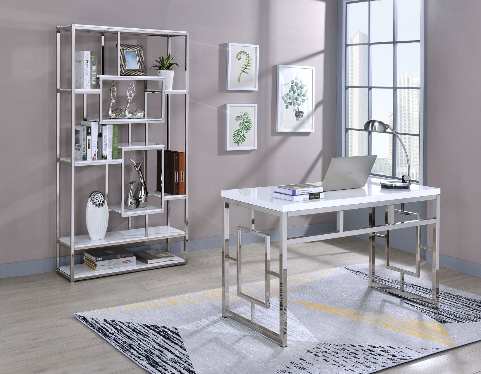 The Alize desk features a stunning design in chrome that encompass modern, artsy styling. The clean, straight lines flow in the design to form a sturdy, but visually appealing aesthetic that feels right at home, no matter the setting. The desk is completed with the use of faux wood Silver shield 3D Laminate top, that resists heat, scratches and moisture. The end panels on the desk feature ends that seamlessly blend with the design elements of your home giving a feel of understated opulence.