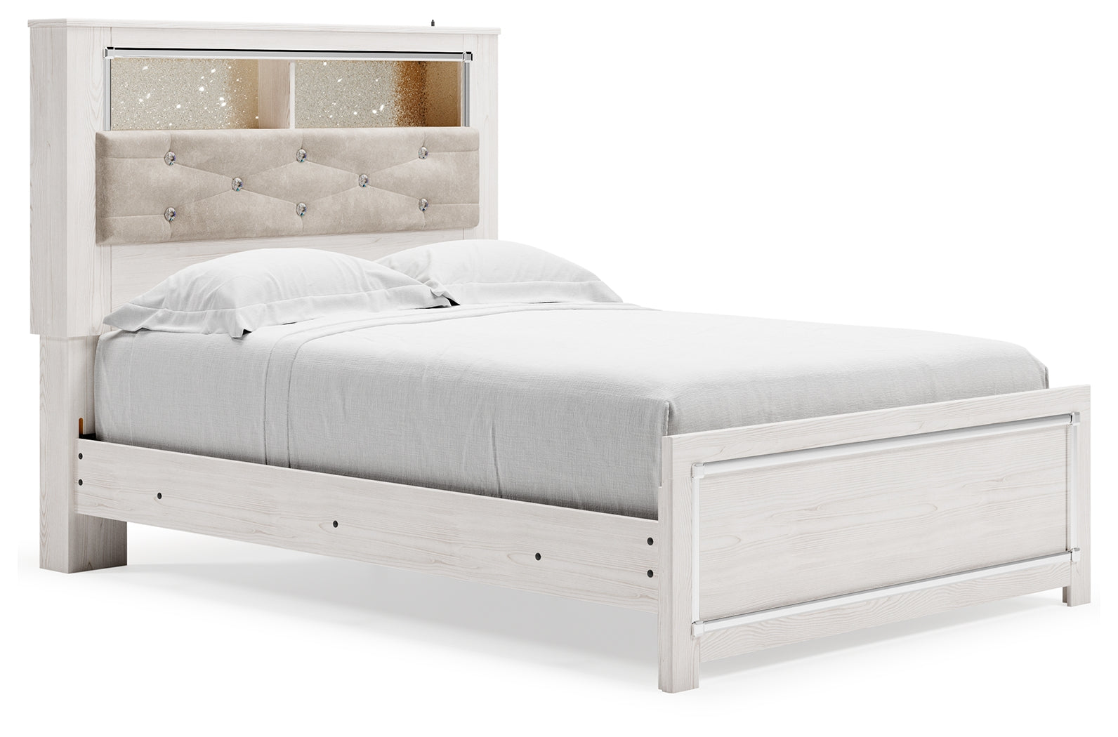 Headboard with gray polyester upholstery with faux crystal button tufting; glitter panel inset bookshelf; LED light strip with remote-controlled color and brightness options