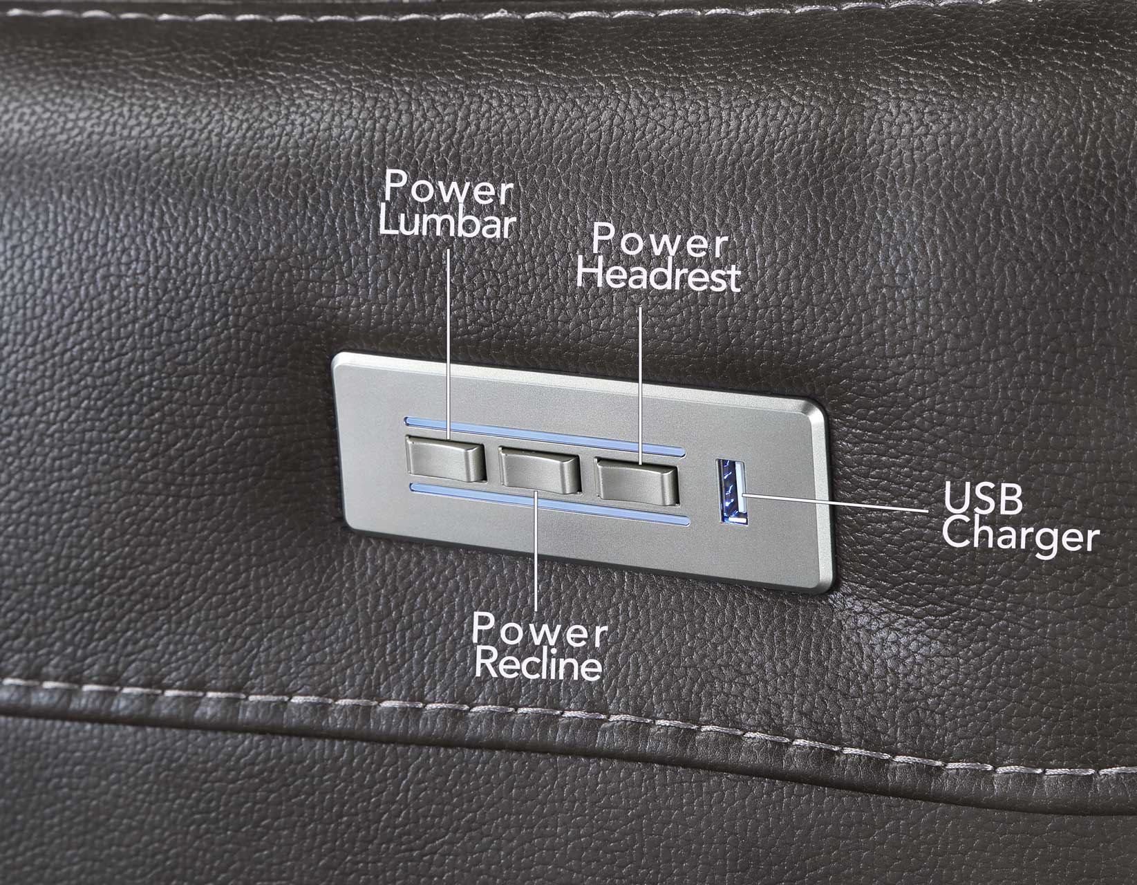 Modern elegance in a triple-power reclining package, Athens shows that style and function can come in one package. This sleek recliner features pencil arms and power footrest, power headrest and power lumbar all in a chair that swivels 360 degrees. Covered in a charcoal faux-leather with baseball stitching, Athens is sure to become the favorite chair in any household.