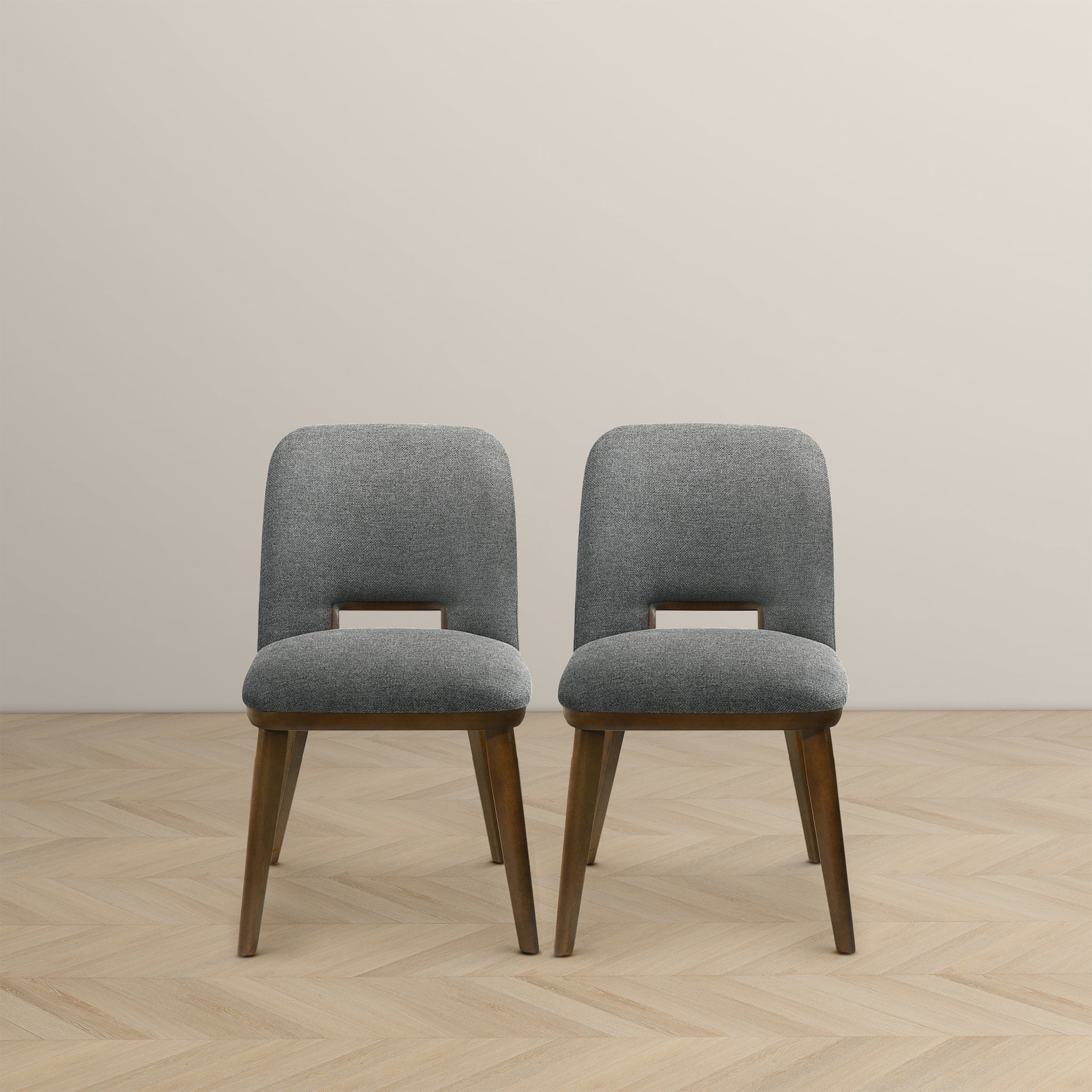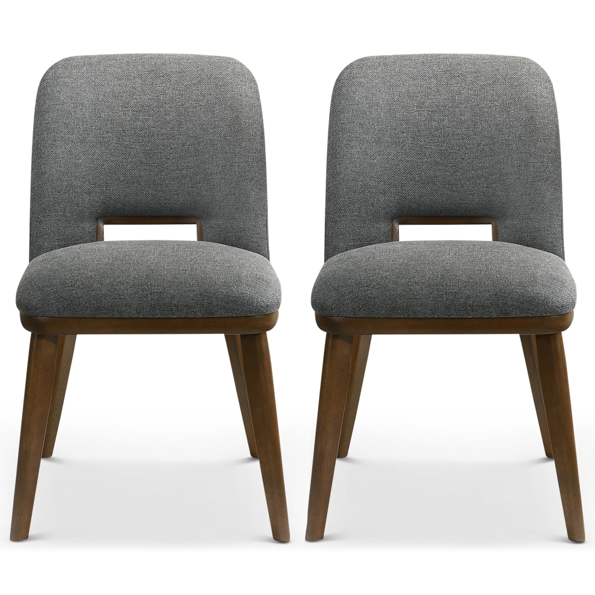 Introducing our Modern Dining Chairs – a harmonious blend of comfort, style, and functionality for your living spaces. Crafted with a solid wood walnut-colored base, these dining chairs effortlessly bring a touch of mid-century modern charm to your home. The set of 2  light grey fabric upholstered chairs not only exude sophistication but also ensure a cozy and comfortable dining experience.