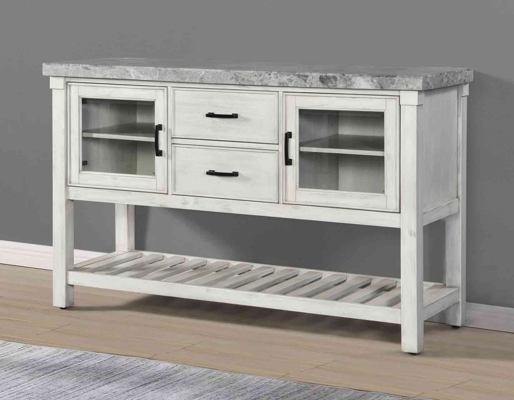 A 52-inch round table with a refined rustic style that combines the polish and beauty of a gray marble top with the rustic complement of a white timber-beam trestle base to form the centerpiece of this charming dining room set. White veining in the gray marble table top blends beautifully with the white finished table base and chairs for a harmonious design that seats up to four. The white and gray microfiber chair matches the set in an easy-care and comfortable seat. The casually elegant style of the table will fit beautifully in farmhouse, cottage, ranch or traditional settings and can be paired with the optional Canova Server for a full dining set.