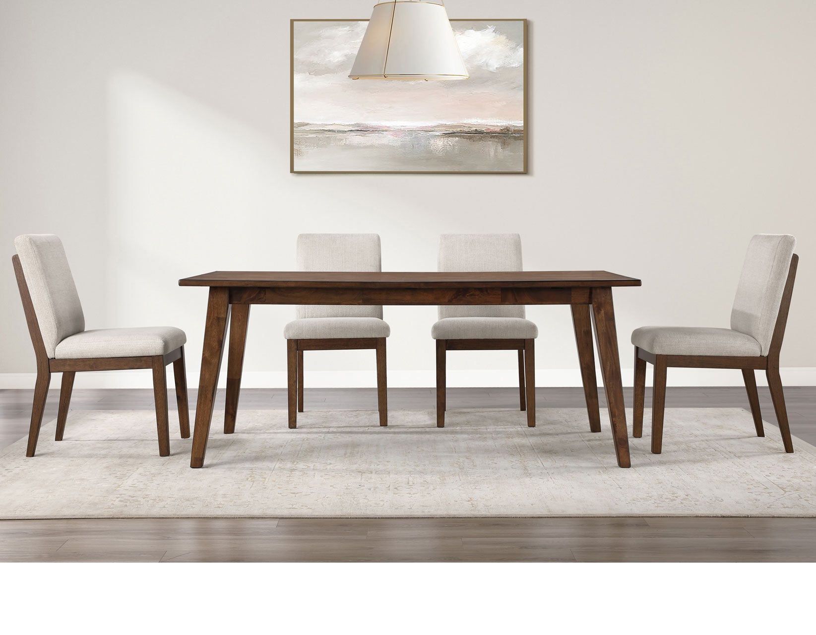 Elegantly casual style arrives in the dining room with the Canton 5-Piece 72″ Upholstered Side Chair Dining Set. Influenced by mid-century modern design and ready to seat up to six, this set showcases a beautiful butcher block top layup and tapered solid wood legs, exuding both elegance and warmth. Crafted from solid mango and Asian hardwoods, it ensures lasting durability. The hand-stained multi-step brown cherry finish highlights the natural grain, while the oatmeal-colored cushioned chair offers a comfortable, stain-resistant surface. Ideal for intimate gatherings, this versatile set combines timeless aesthetics with exceptional stability, making every meal memorable.