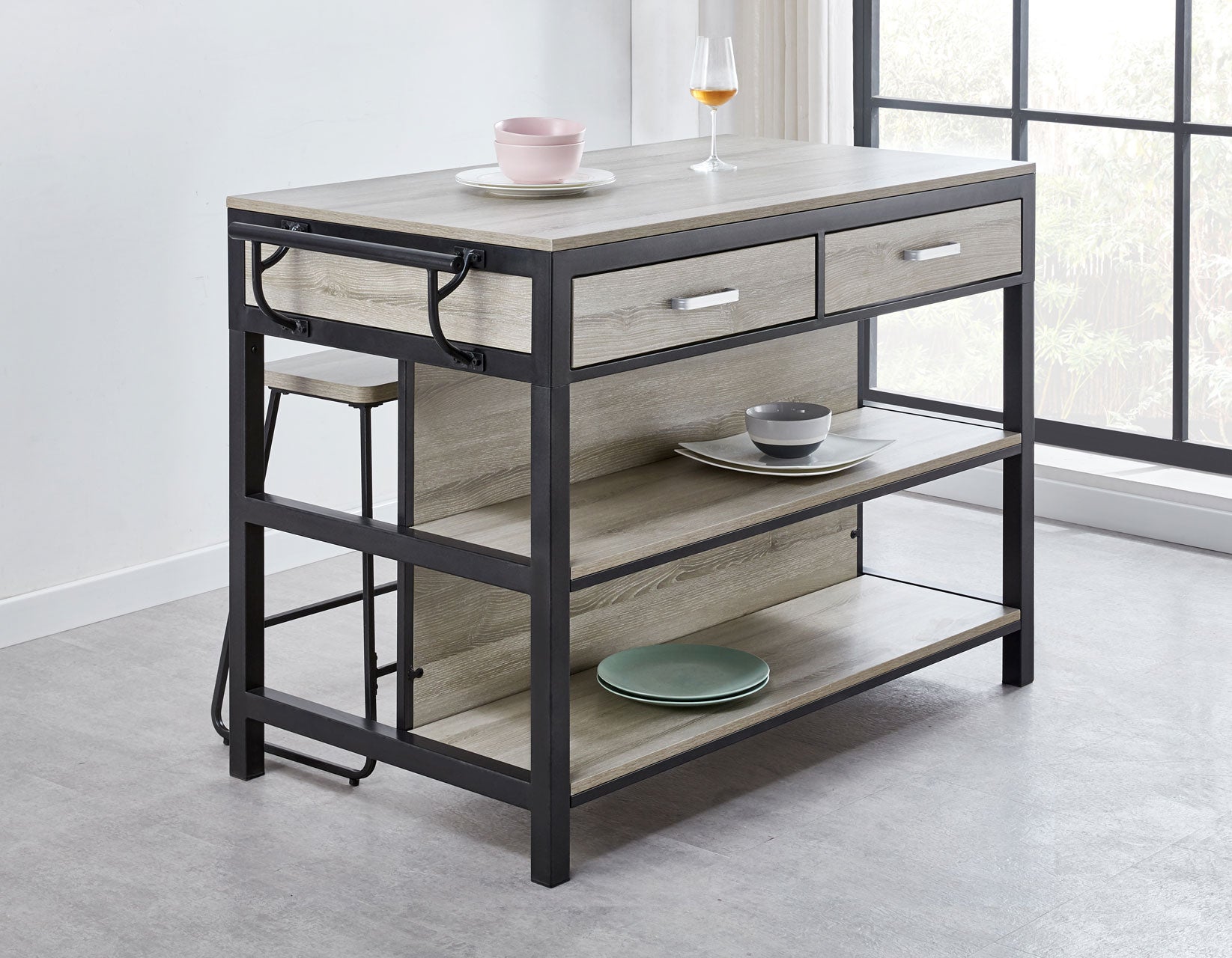 Function, style and compact design are the hallmarks of the Carson dining set. This counter-height dining set packs a lot of features in a small area dining set with seating for two, ample display area and dual towel racks for quick cleanup. This set works great as a room divider in a loft or for a cozy seating area while the weathered driftwood finish is sure to complement any home interior.