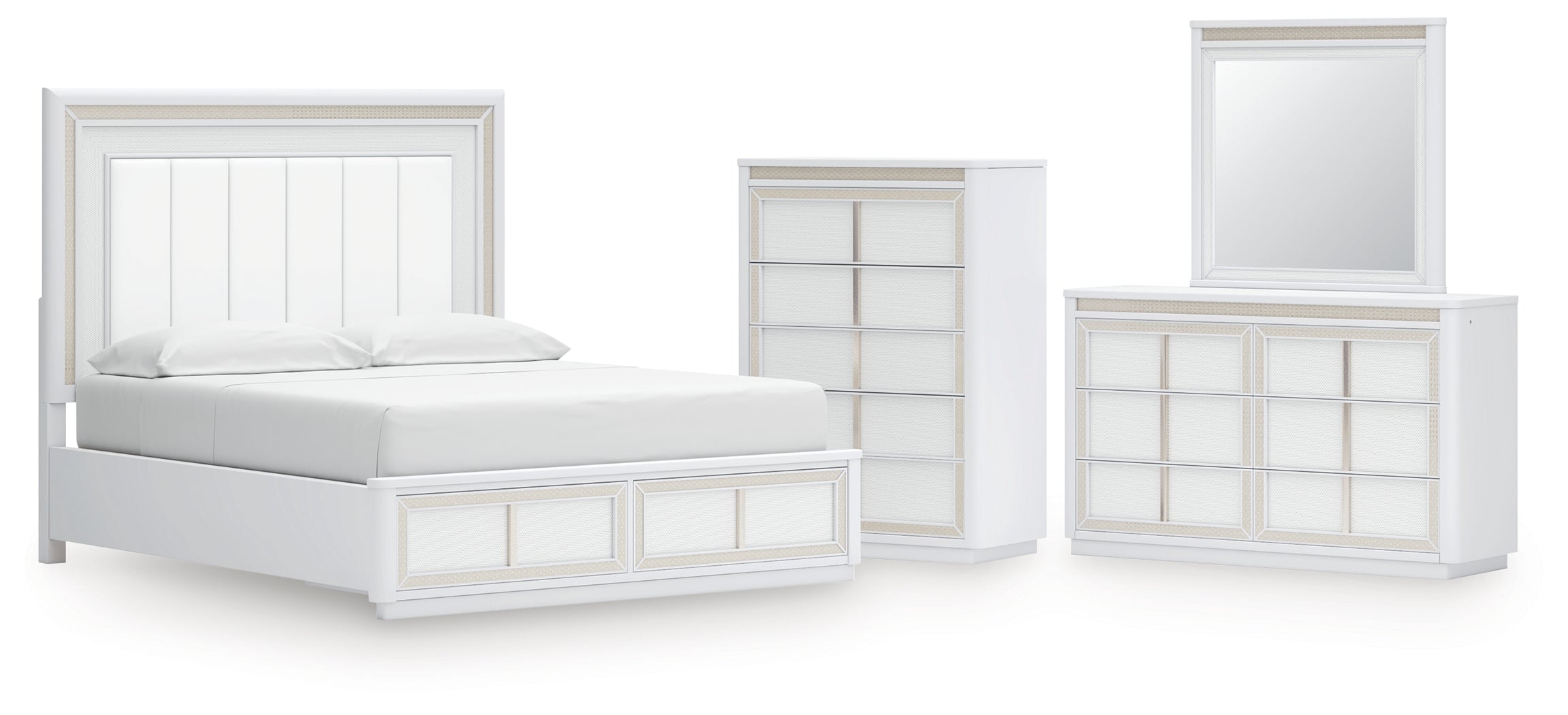 Chalanna California King Upholstered Storage Bed with Mirrored Dresser and Chest in White