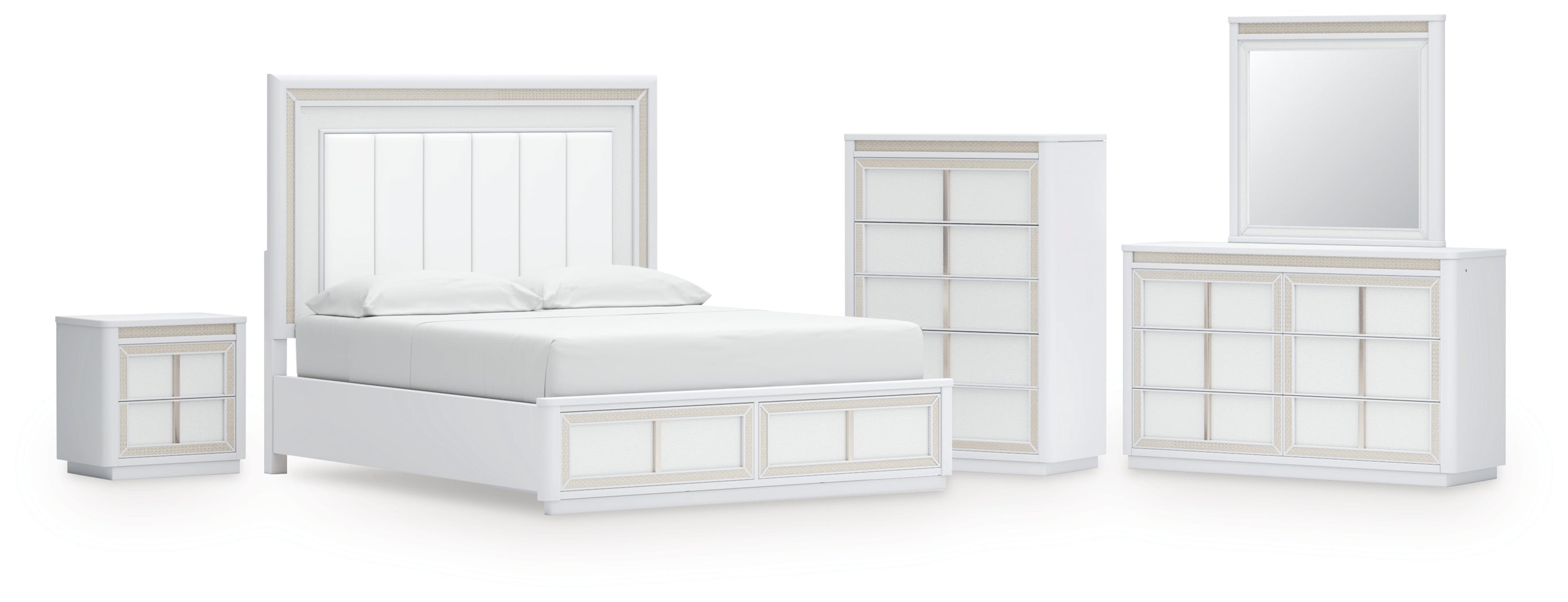 Chalanna California King Upholstered Storage Bed with Mirrored Dresser, Chest and Nightstand in White