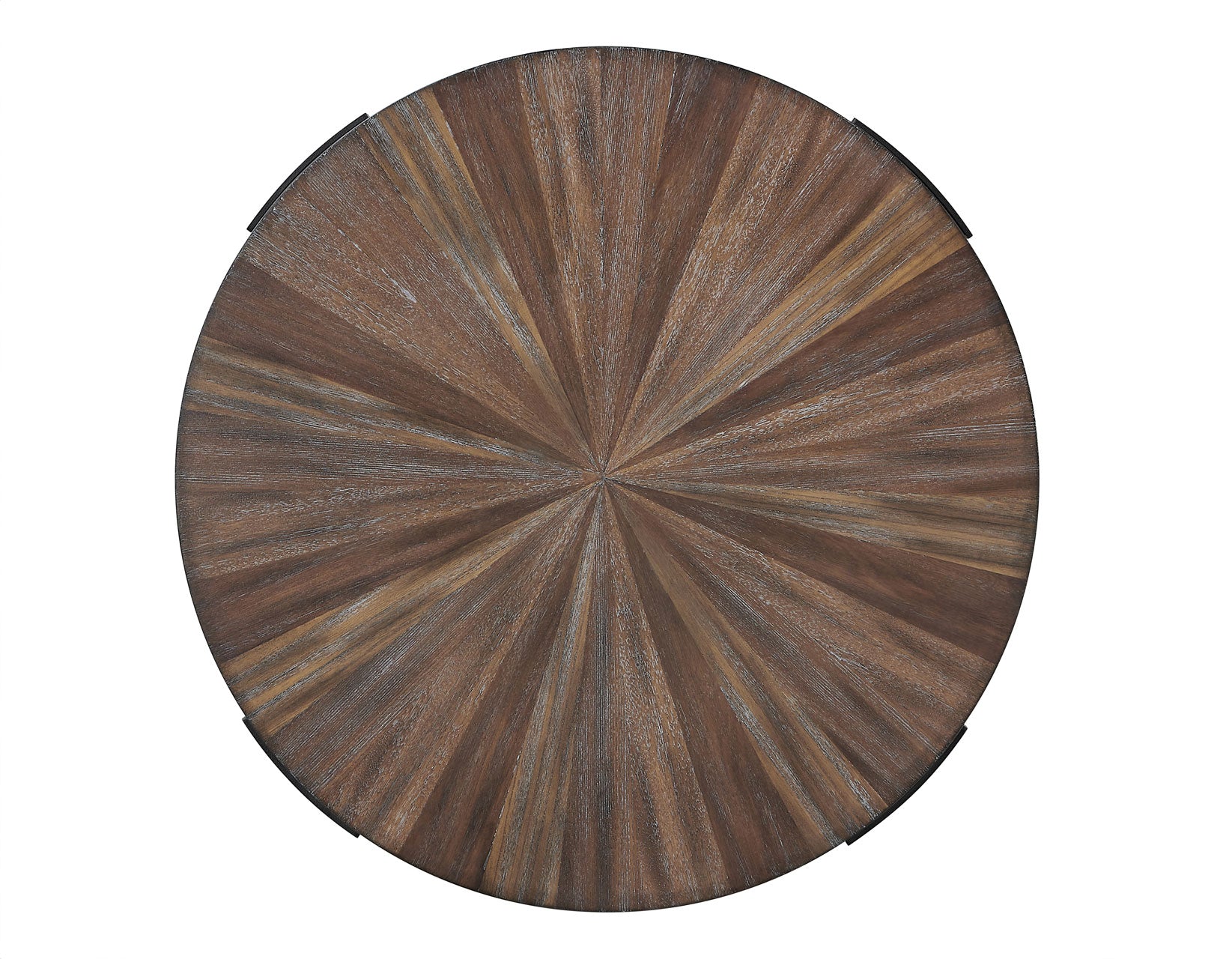 Modern meets rustic magic with the Chevron 22-inch end table. Think warm cinnamon hues dancing on elm, acacia, and veneer, kissed by hand-stained charm. This little gem brings cozy minimalism to any space, its sleek, round silhouette never overstaying its welcome. Black-coated iron forms a modern base, a perfect foil for the rustic wood whispers. Small spaces sing with the Chevron. It tucks next to sectionals, embraces loveseats, and plays sidekick to any sofa, adding just the right touch of earthy elegance.