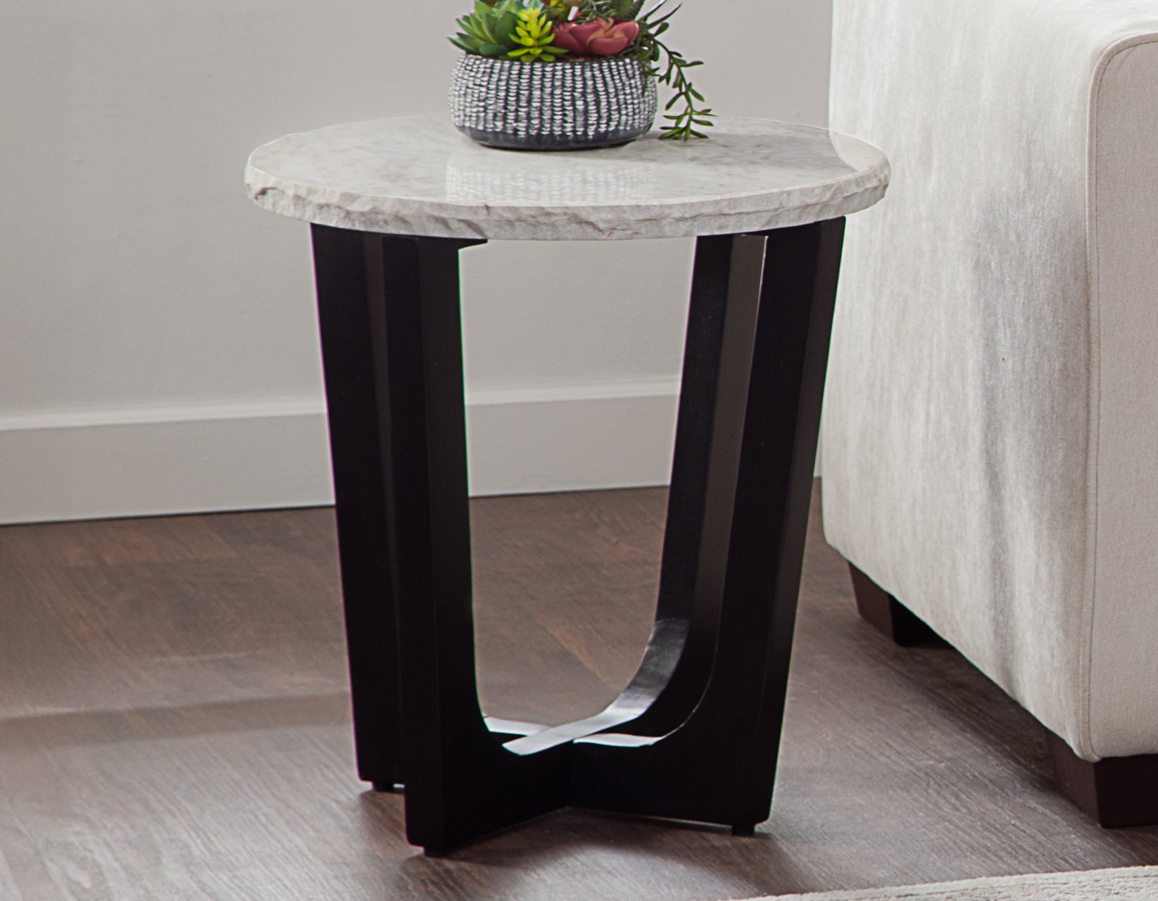 The Chrissy End Table blends modern design with natural elegance, making it a stylish accent for any space. Expertly crafted, it features a 30mm solid white marble top with a raw, live edge, combining a smooth polished surface with rugged, chiseled texture for striking contrast. Each marble top is one-of-a-kind, showcasing unique veining and natural variations that add to its organic charm. The 20” round top sits on a solid wood sled base, finished in bold black for a sleek, modern touch.