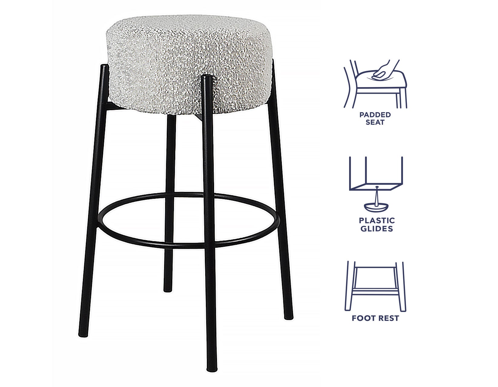 The Cole 26″ Counter Stool is your ticket to elevated comfort and style at your kitchen counter. Crafted with precision, this stool combines convenience with chic aesthetics to transform your space. At a perfect 26″ height, the Cole Counter Stool is tailor-made for 36″ high counters, offering just the right perch for casual dining or catching up with loved ones over coffee. Sink into its plush 7″ seat, generously cushioned with 1.2 density foam, ensuring hours of comfortable seating. The design is where the Cole truly shines. Cold-rolled tubular steel legs provide sturdy support while adding a touch of industrial flair to your decor. But it’s the boucle polyester cover that steals the show, embracing the seat in a snug embrace between the legs, creating an intriguing visual element that’s as functional as it is eye-catching.