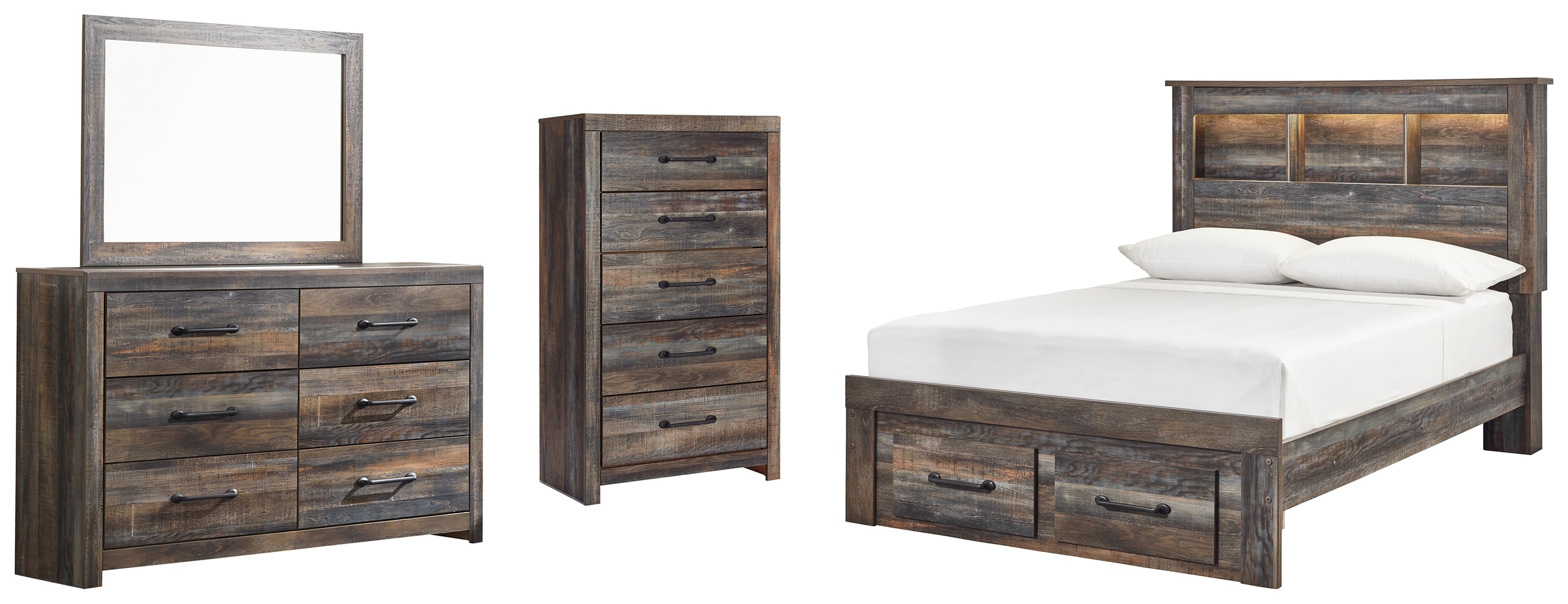 Includes bed (with bookcase headboard, 1-drawer storage footboard and rails), 6-drawer dresser with mirror and 5-drawer chest
