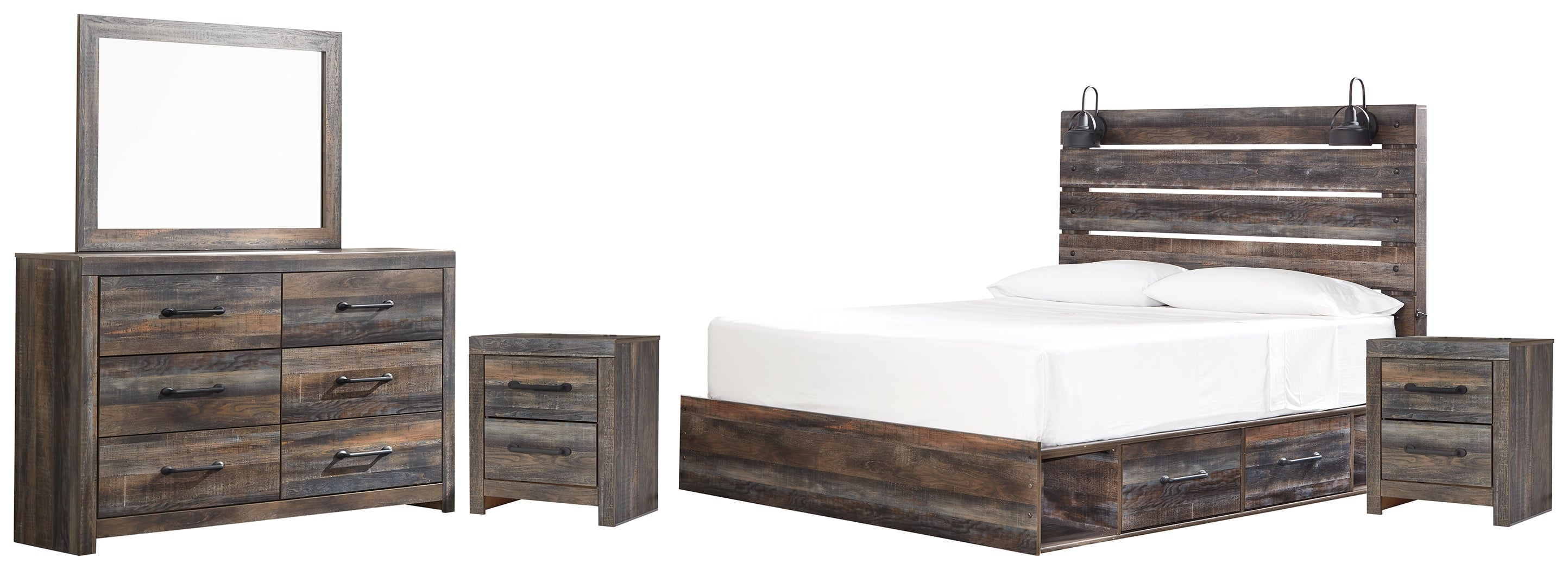 Drystan King Panel Bed with 2 Storage Drawers with Mirrored Dresser and 2 Nightstands in Multi