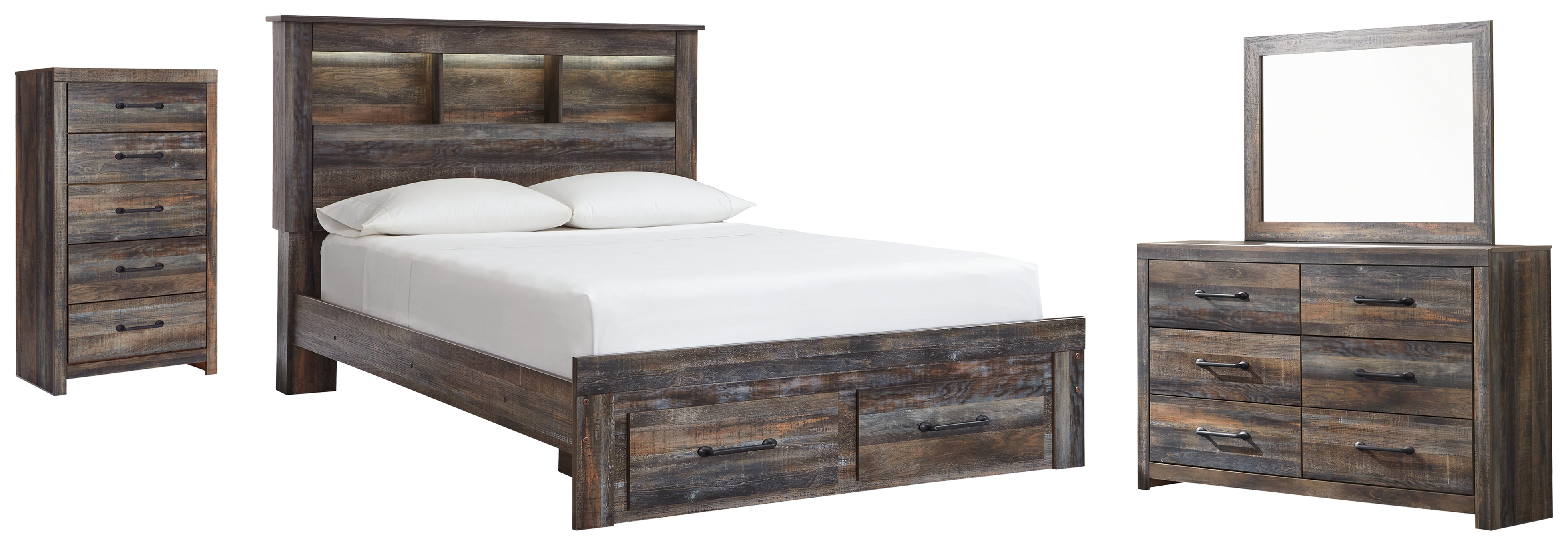 Includes bed (with bookcase headboard, 1-drawer storage footboard and rails), 6-drawer dresser with mirror and 5-drawer chest