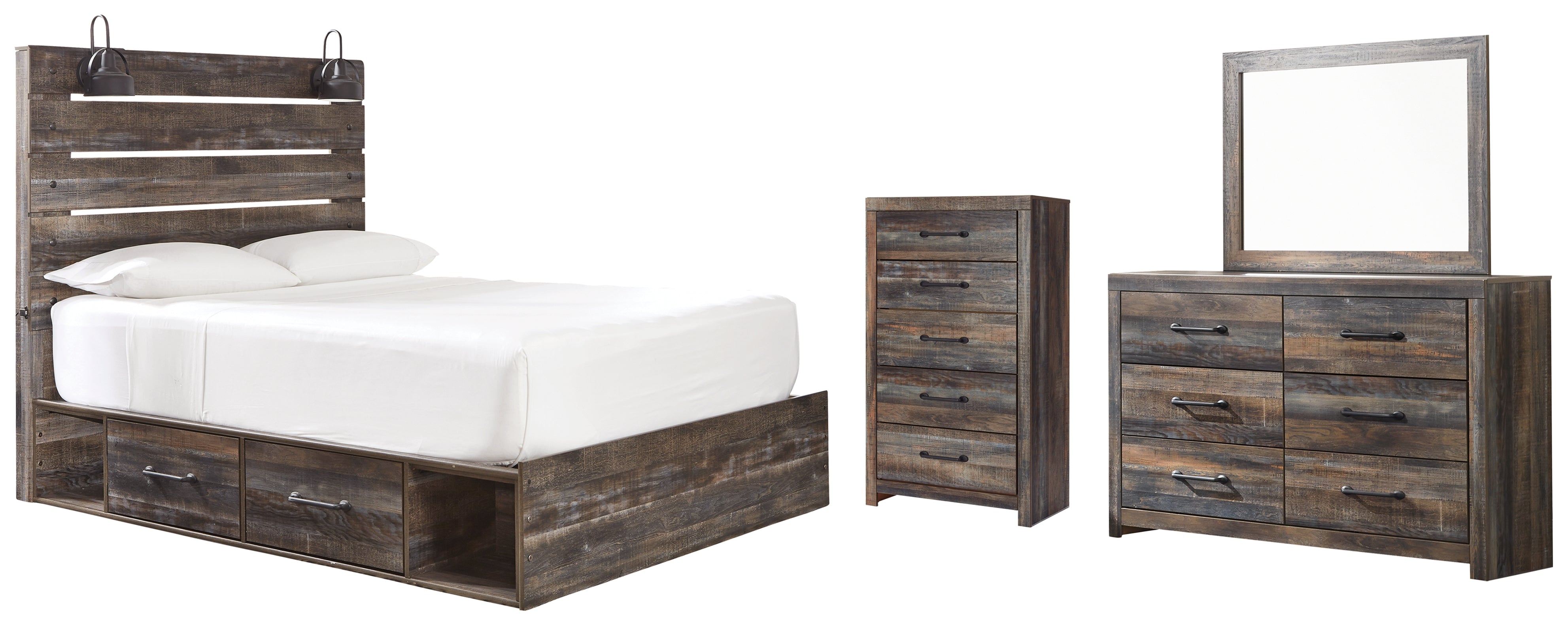 This twin-size panel bed with storage, dresser, mirror and chest of drawers is a refined take on barn board beauty. Its complex, replicated wood grain showcases hints of burnt orange and teal tones for a sense of weatherworn authenticity. Those who love to read in bed are sure to find the retro-chic light sconce and USB plug-ins on the open-slat style headboard such a bright idea. Underneath the bed: smooth-gliding drawers and open cubbies that accommodate casually cool storage bins. The dresser and chest with smooth-gliding drawers lined with faux linen laminate and industrial dark-tone hardware complete this rustic and industrial style bedroom. Mattress and foundation/box spring available, sold separately.