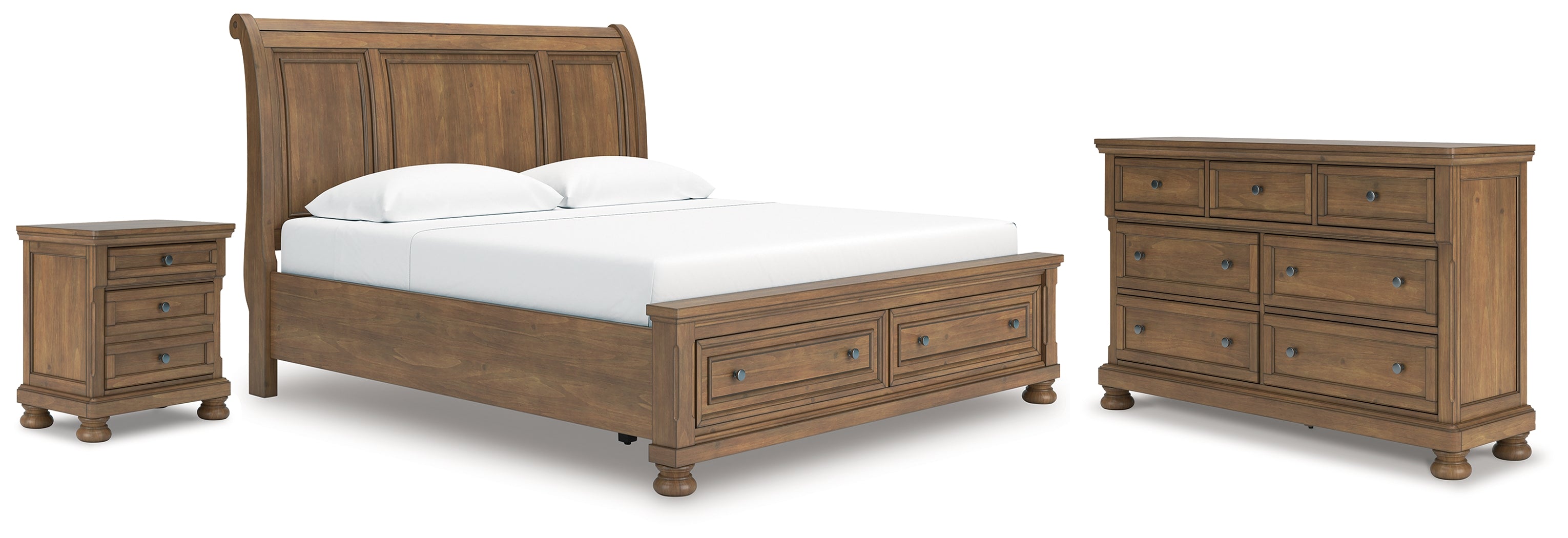 Feddinger King Storage Sleigh Bed with Dresser and Nightstand in Medium Brown