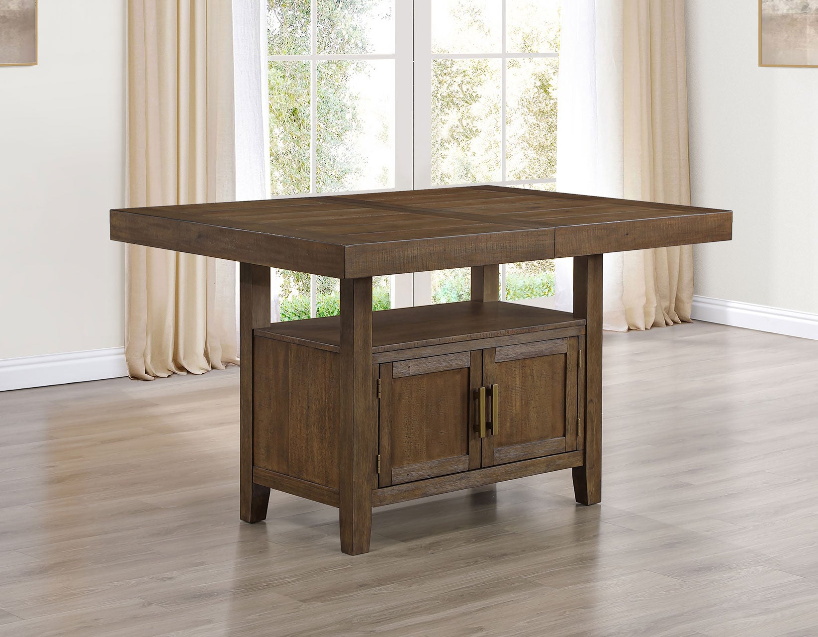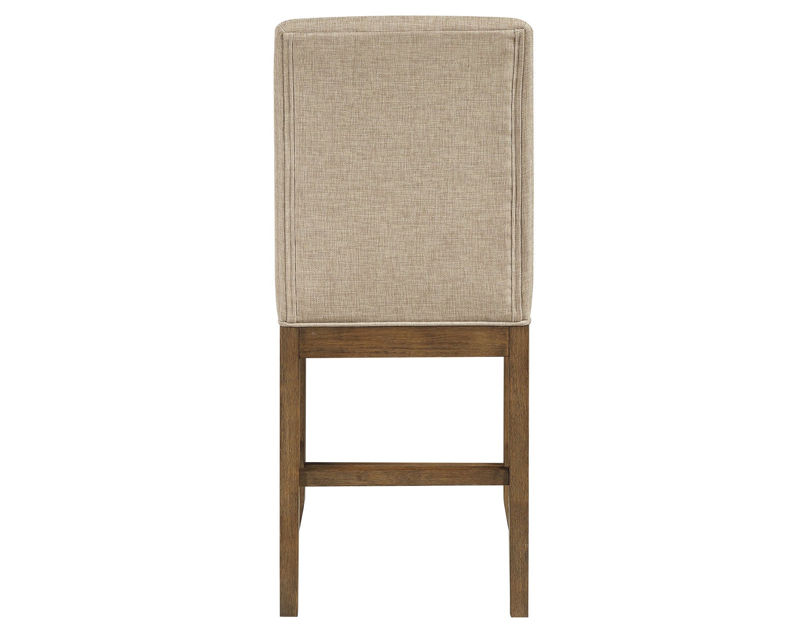 Sophisticated yet relaxed, the Garland Counter Height 5-Piece Dining Set is designed to shine in any space. A distressed toffee finish complements its modern profile, creating a seamless blend of casual elegance. The 36″ counter height table offers a comfortable setting for both dining and standing work, while its faux plank top, enhanced with rasping and threading distressing, adds character and warmth. Paired with four fully upholstered counter chairs featuring tailored canvas covers and brushed brass-tone accents, this set perfectly balances casual and formal elements for an inviting and stylish dining experience.Crafted of oak and acacia veneers; acacia, mango, Asian hardwood solids; and engineered woods