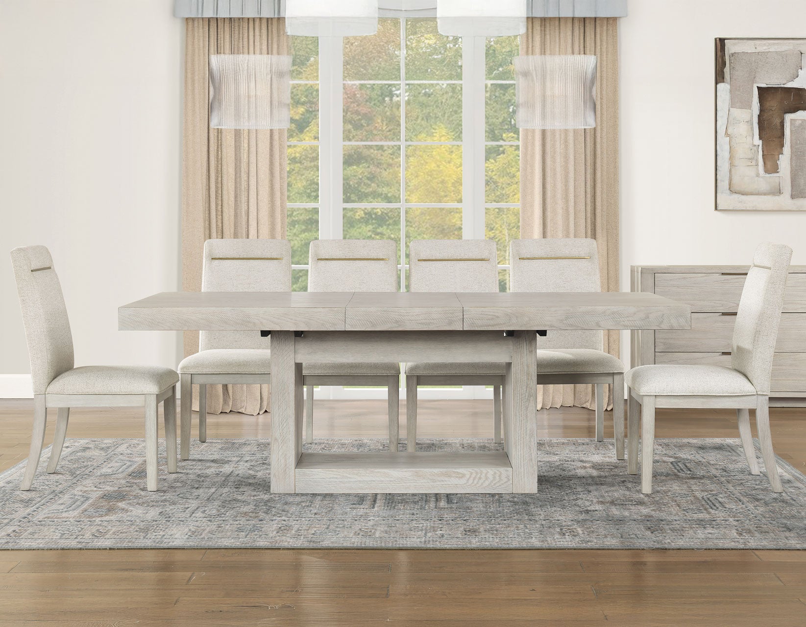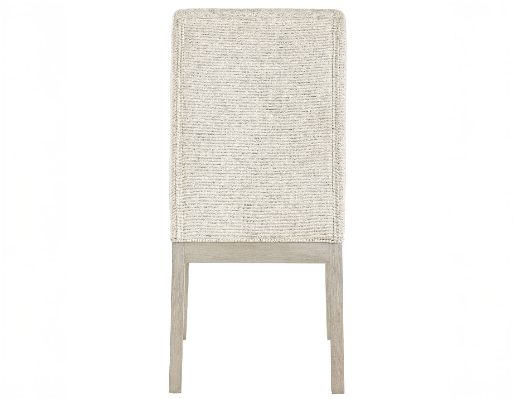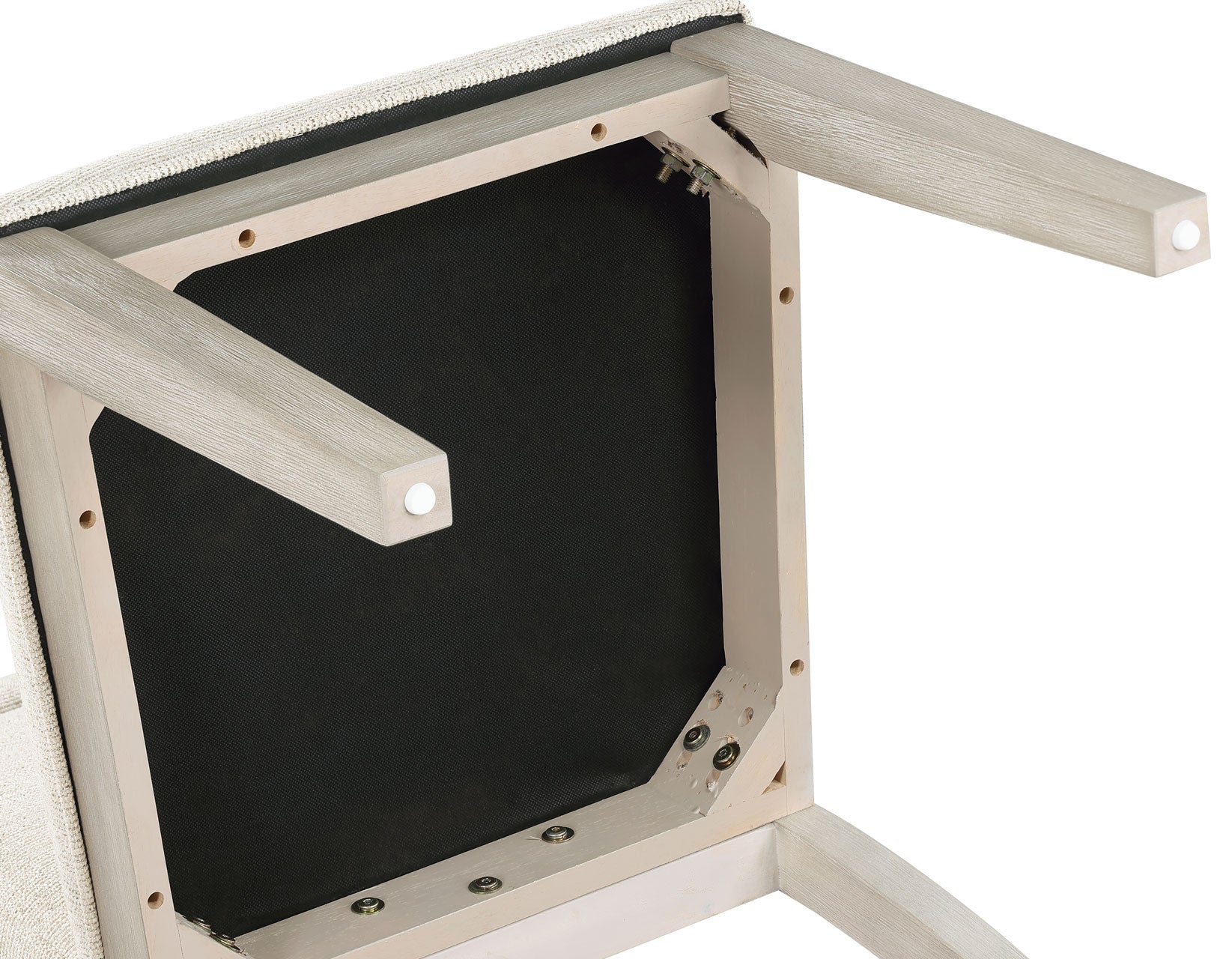 Sophisticated and elegant with a casual touch, the Garland Side Chair is designed to shine in any space. The fully upholstered Parsons chair features a tightly tailored oatmeal fabric cover, complemented by a brass accent that effortlessly blends casual and formal styles. The lightly distressed solid wood legs showcase a versatile distressed greige finish, adding warmth and character to any room. Refined yet inviting, this chair brings a perfect balance of comfort and sophistication to your dining space.