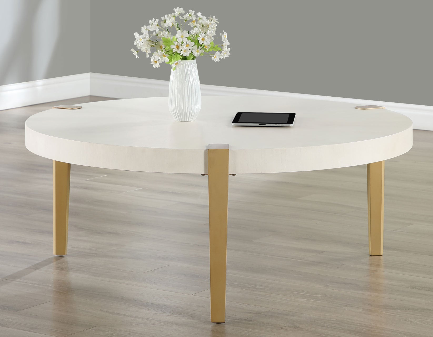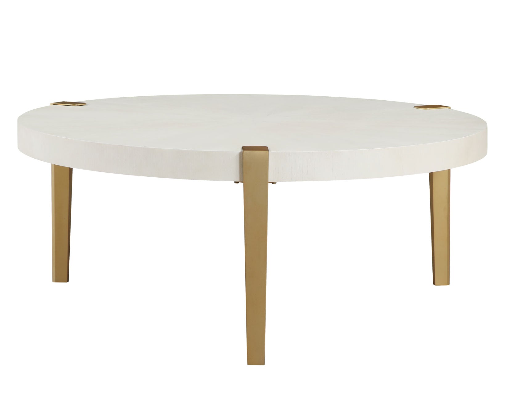 Elegant and commanding, the Gracie White Cocktail Table is a stunning blend of modern industrial charm and elegant design. This elegant and commanding 48-inch round table stands proudly on three satin gold finished metal legs, geometrically shaped and exposed on top, adding a bold, contemporary look. Its round, flowing silhouette with a washed white finish showcases oak veneers in a mesmerizing sunburst layup. Light and airy, this distinctive piece enhances any space with its impressive size and striking design, bringing both style and functionality to your room. Ideal as a centerpiece, it effortlessly combines beauty and utility.