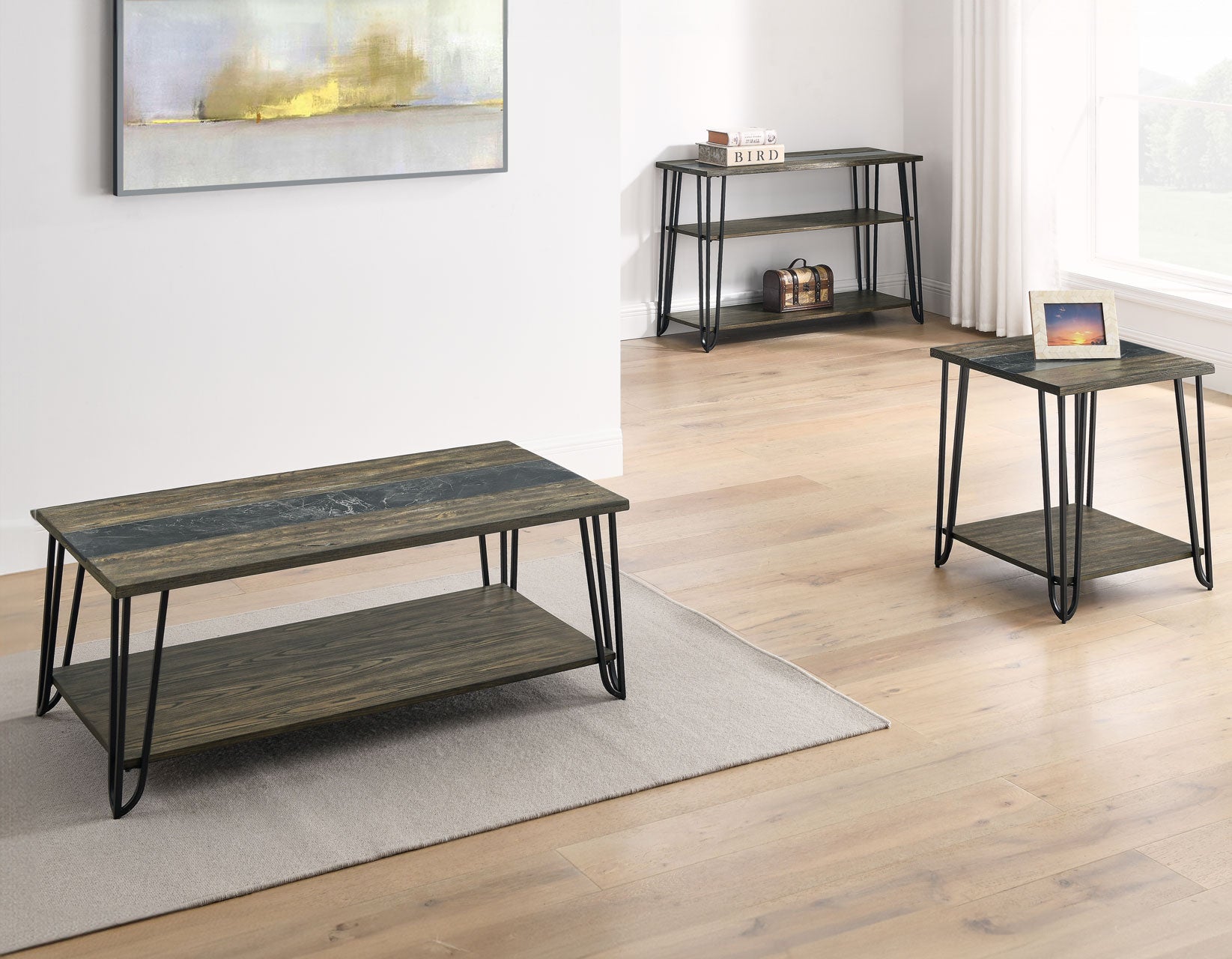 The Harper End Table is a masterful blend of casual rustic charm and mid-century modern elegance. Crafted with a distressed dark driftwood finish and a striking sintered stone inlay, it’s a mixed-media gem that is the perfect side table or bedside companion. Its canted iron legs add a touch of retro flair, while the bottom shelf offers ample space for display or storage. This table is an ideal centerpiece for a casual yet modern living room, offering both style and functionality.