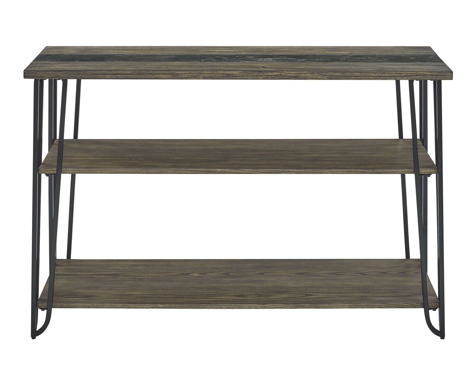 The Harper Sofa Table is a masterful blend of casual rustic charm and mid-century modern elegance. Crafted with ash veneers in a distressed dark driftwood finish and a striking sintered stone inlay, it’s a mixed-media gem that is the perfect behind the soft table, hallway hub or small entertainment unit. Its canted iron legs add a touch of retro flair, while a bottom and middle shelf offer ample space for display or storage. This table is an ideal centerpiece for a casual yet modern living room, offering both style and functionality.