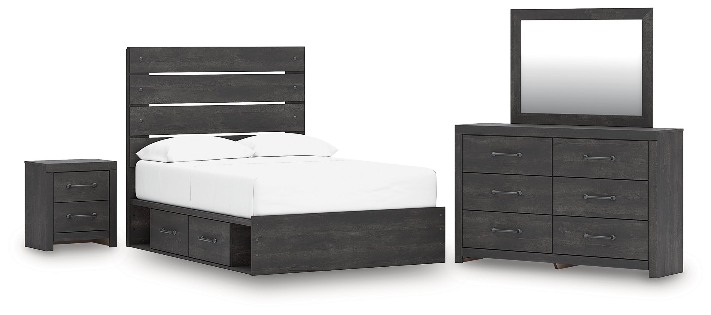 Hollivern Full Panel Bed with Storage with Mirrored Dresser and Nightstand in Dark Gray