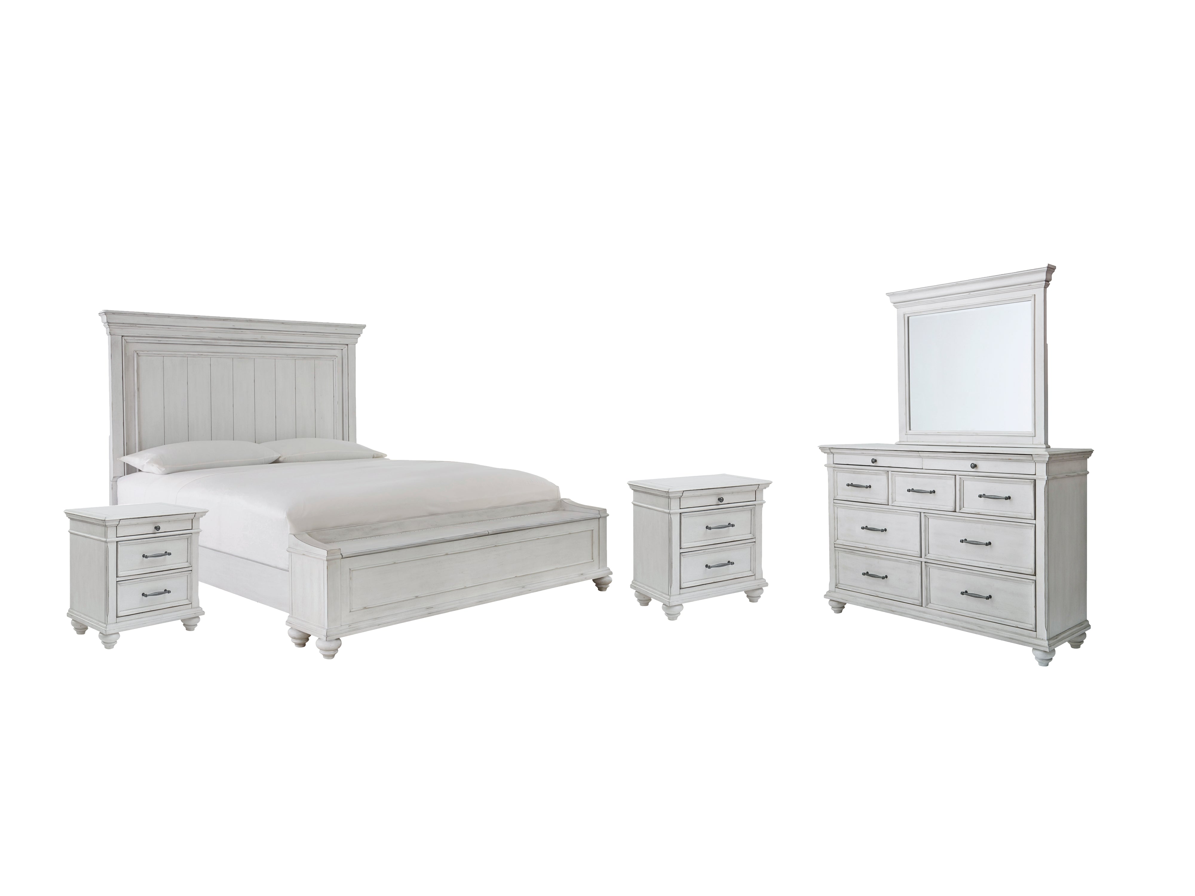 Kanwyn Queen Panel Bed with Storage with Mirrored Dresser and 2 Nightstands in Whitewash