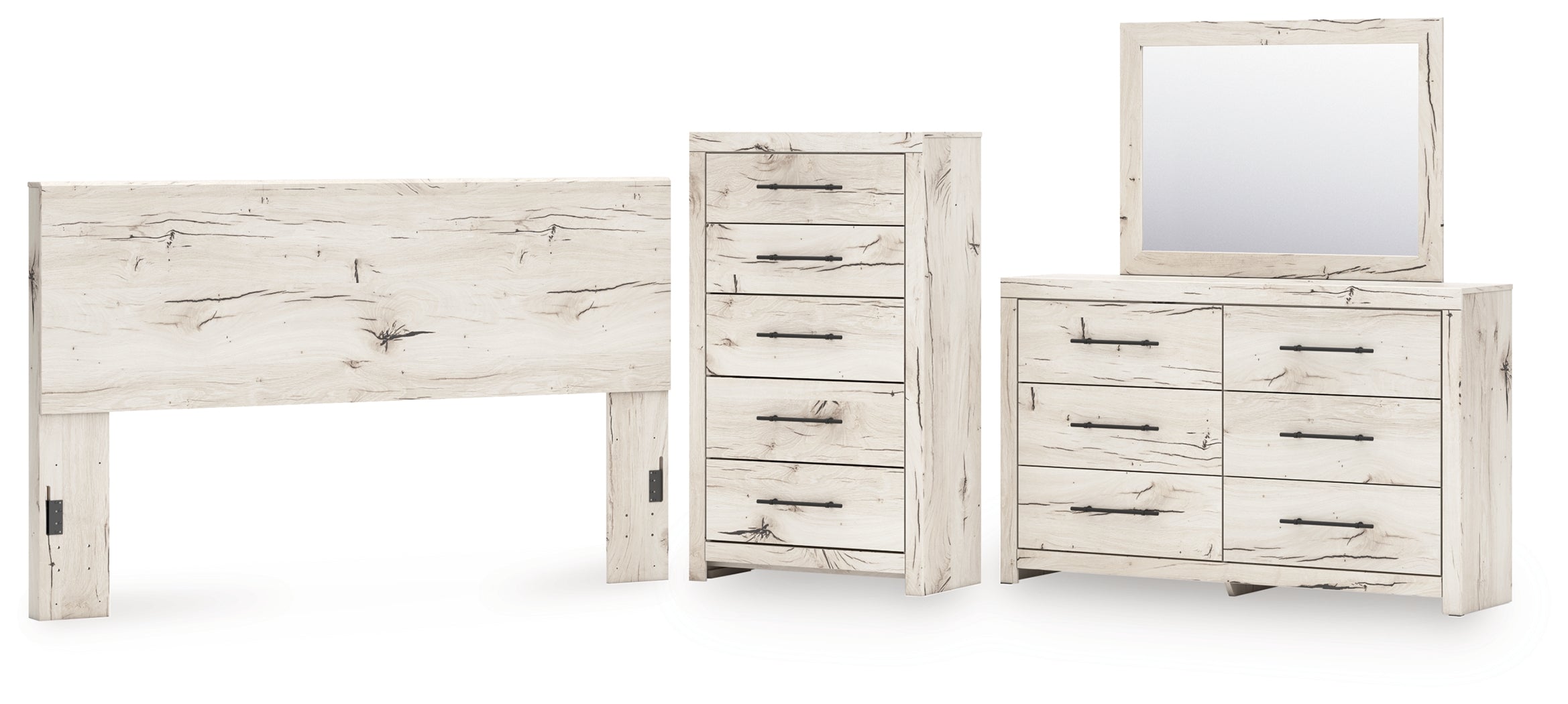 Lawroy King Panel Headboard with Mirrored Dresser and Chest in Light Natural