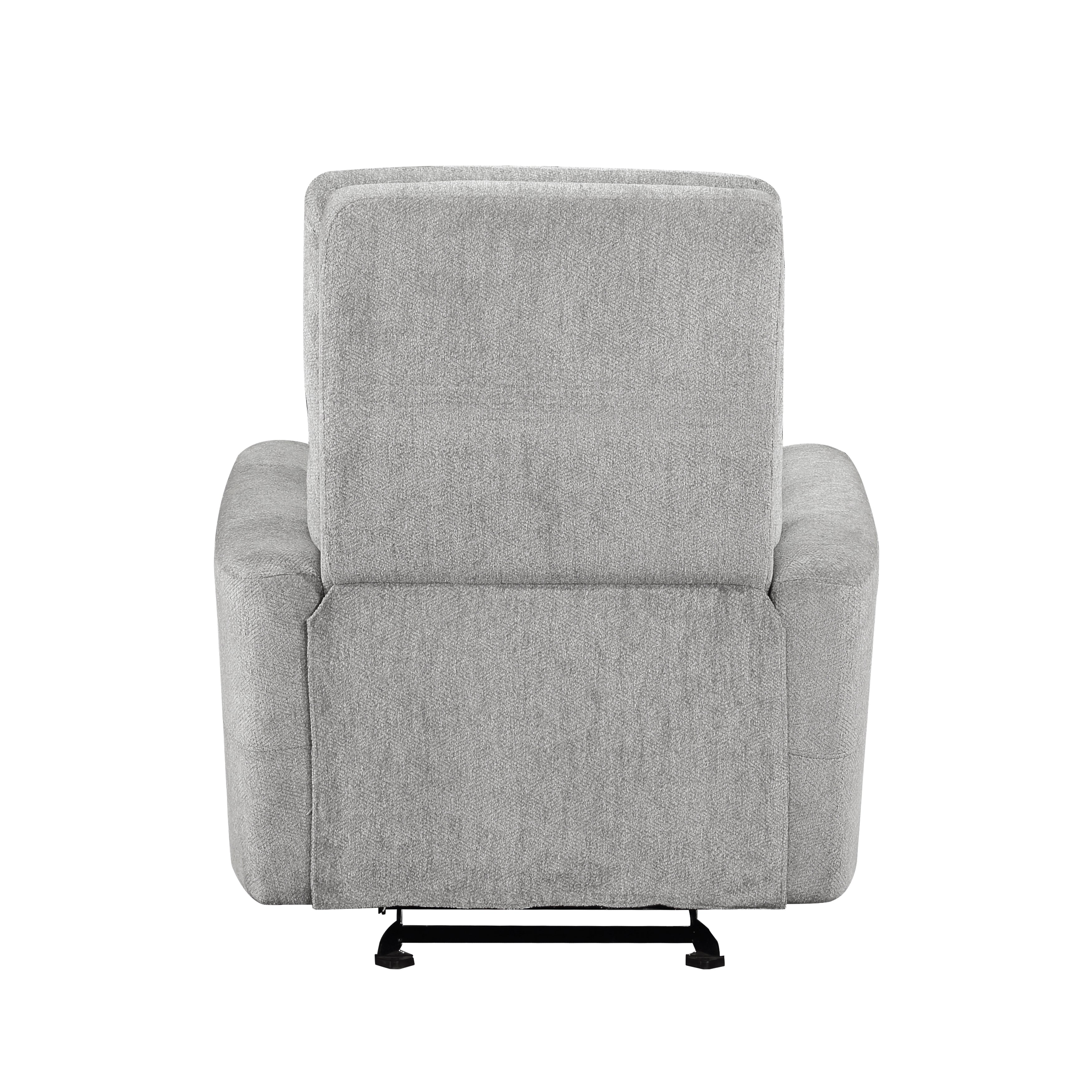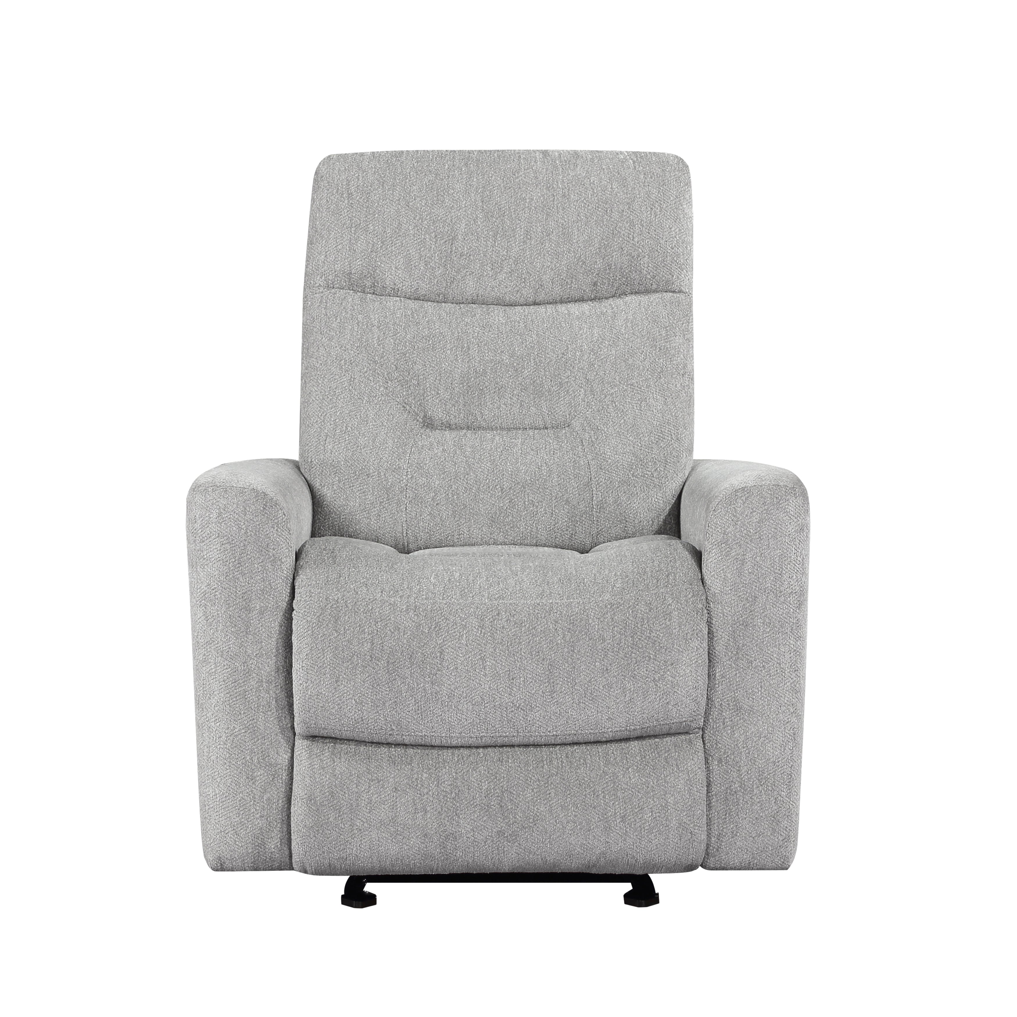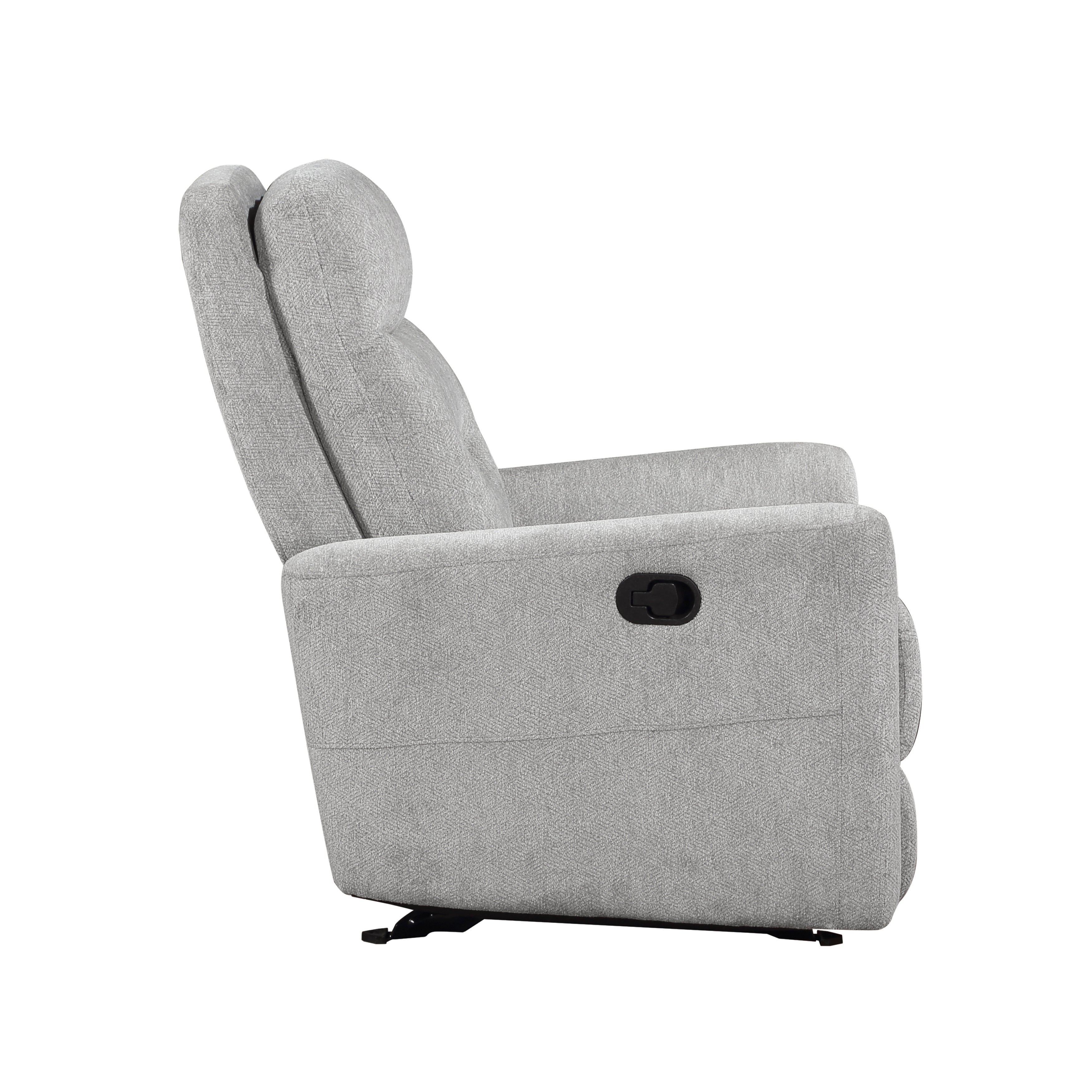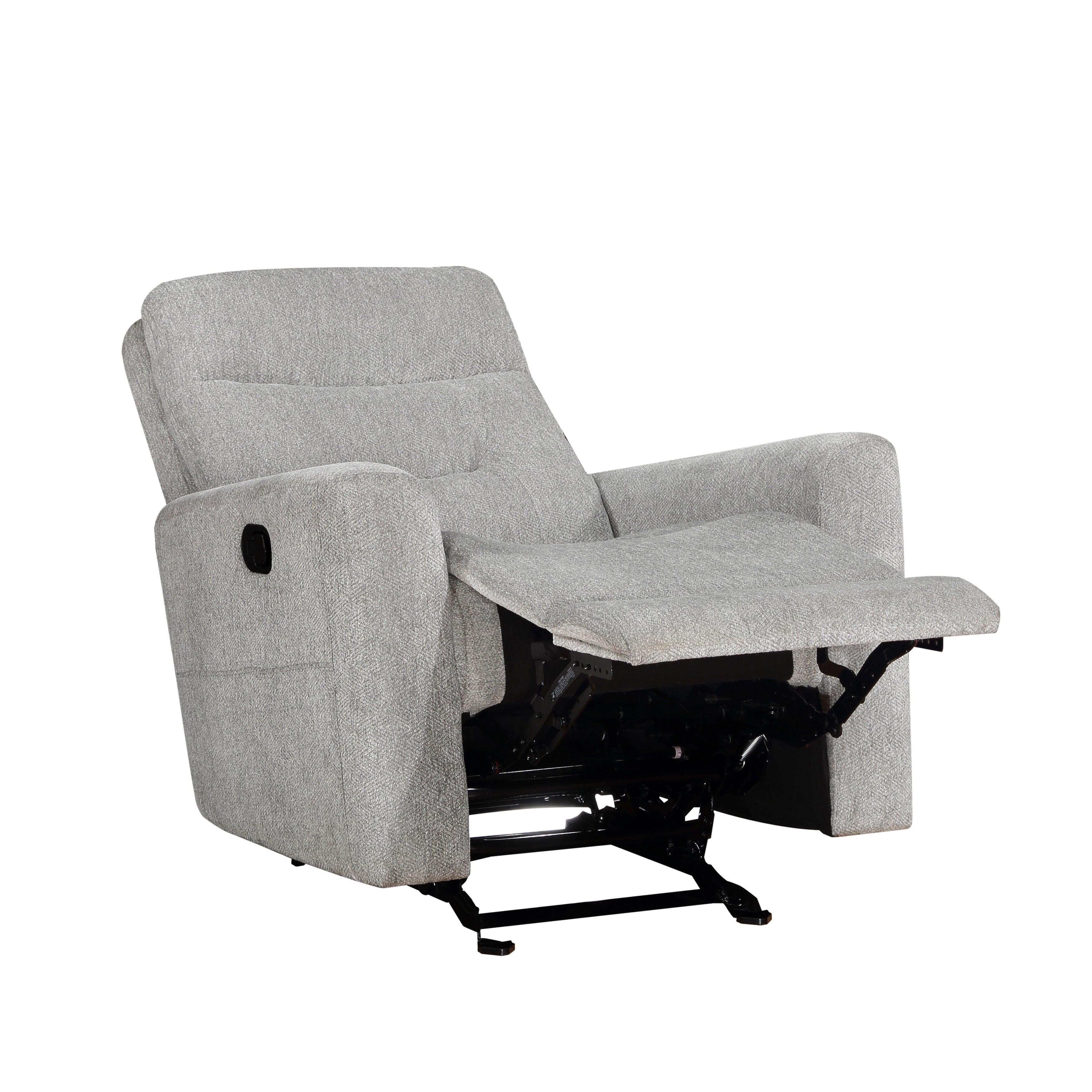 Your comfort is at hand in the design of the Lyndon Collection. The dual reclining ends of the sofa and love seat, and the single mechanism of the glider reclining chair, are engaged with a pull of the side-mounted tab. The love seat features a center console, with cupholders and hidden storage providing functional accent to your seated experience. Gray chenille fabric upholstery covers the plush, subtle modern framing, furthering your comfort, and serving as a neutral palette for your living room décor.