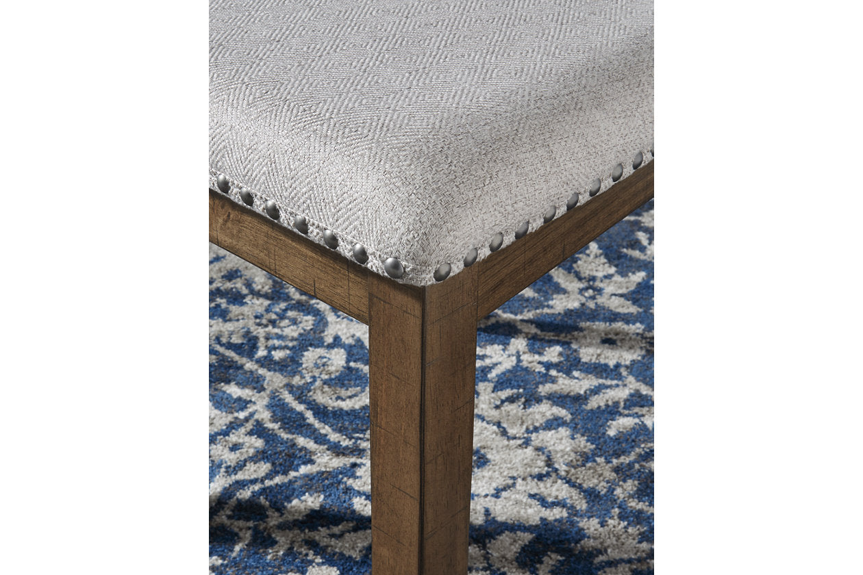 This upholstered dining chair elevates the art of casual rustic style. With a distressed nutmeg finish, antiqued nailhead trim and textured polyester fabric, this upholstered dining chair with classic X back styling entices with warmth and earthy elegance. Cushioned seat accommodates lingering meals enjoyed in comfort. — Luna Furniture introduces Moriville Dining Chair to enhance the beauty of your living spaces.