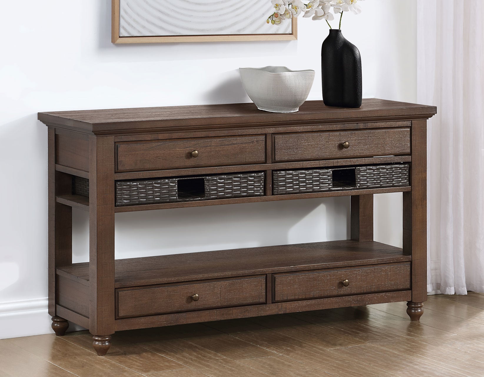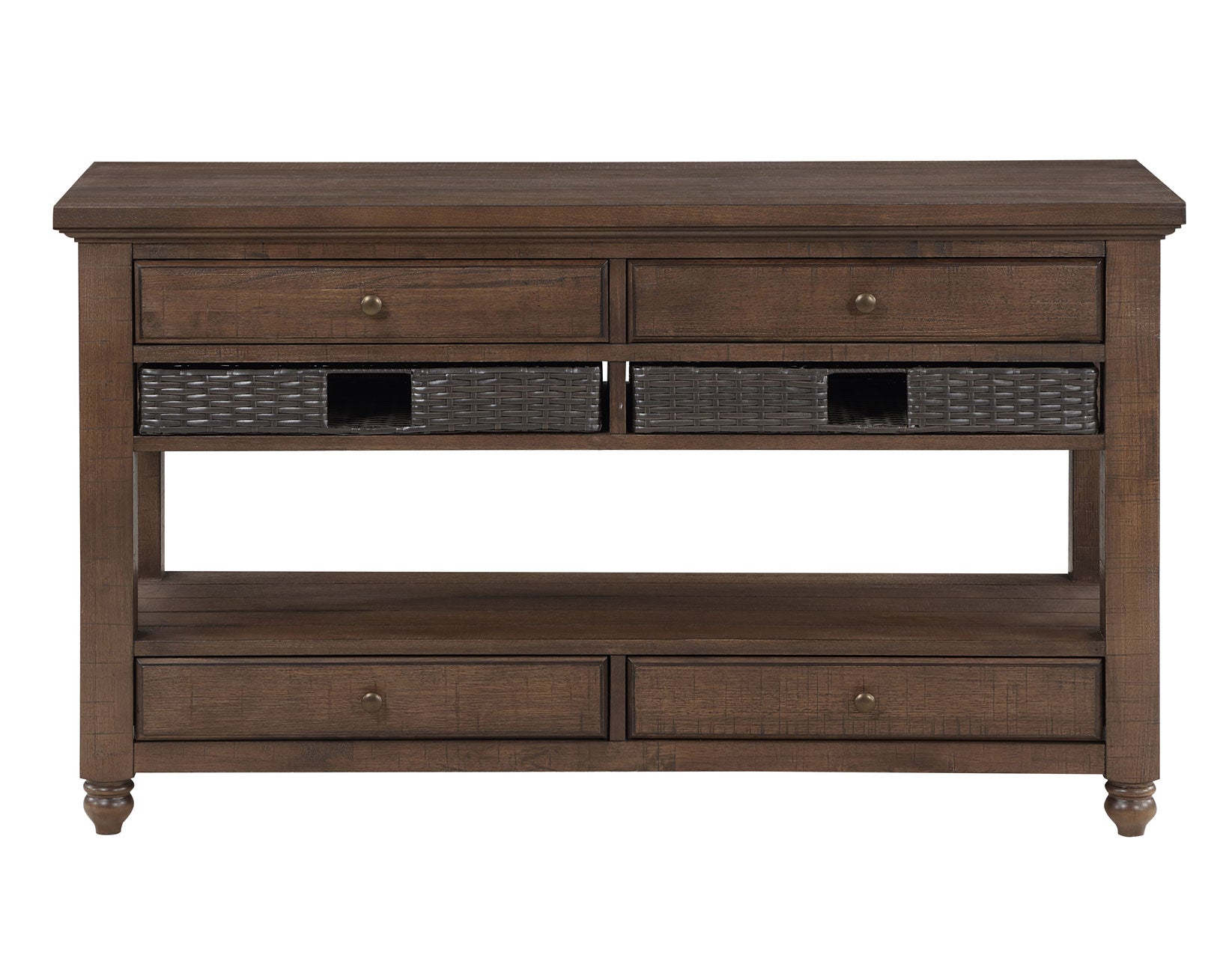 A wonderful addition to a hallway or living space, the Oliver Sofa Table boasts boundless storage possibilities with four drawers and two removeable baskets. This sofa table combines farmhouse charm with classic styling seamlessly, boasting four full drawers and two removable baskets, . The burnished chestnut finish infuses warmth into its aesthetic, while details like the turned bun foot, plank top, and waterfall edge enhance its visual appeal. The Oliver Sofa Table proves to be a dependable and functional accent, blending style and practicality effortlessly. Expertly crafted of acacia veneers, Asian hardwoods solids and engineered woods