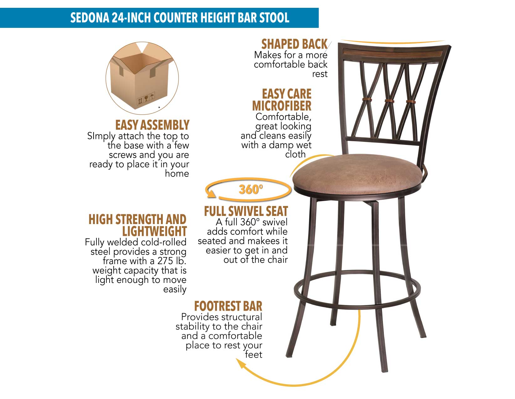 Comfort, style and durability in a Commercial Grade strength Bar Stool, Sedona adds some mixed media style to any counter area. A lustrous brown cherry finish pairs with powder-coated metal finish and brass accents for a sturdy complement to any kitchen. The dark camel leatherette seat is a full 360 degree swivel for maximum comfort. This 30″ seat high chair works with any 42″ counter including  Bar counters.