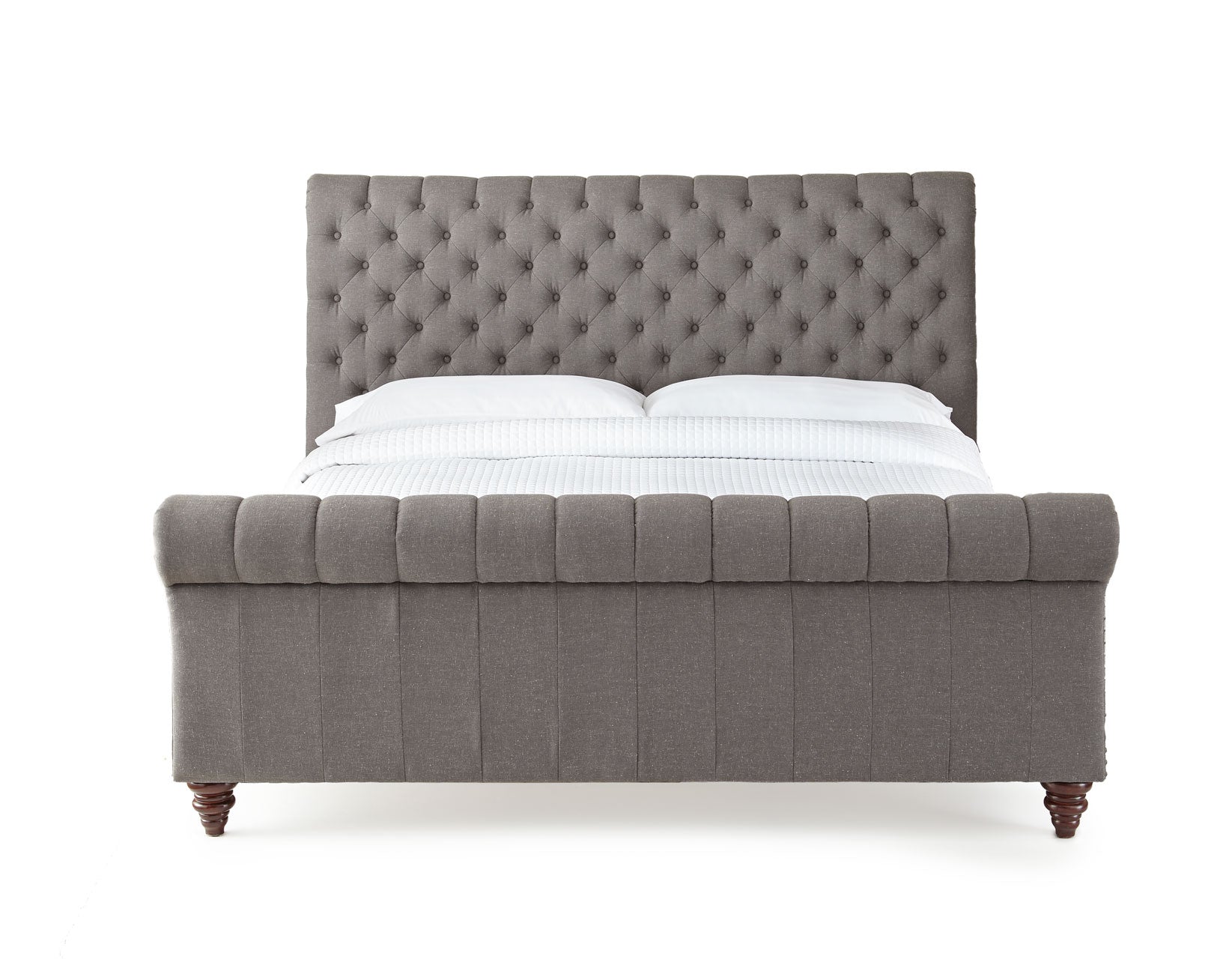 Relax in comfort with the Swanson upholstered bed from Steve Silver Company. A tufted headboard and nailhead trim are just some of the details built into this bed. The rolled headboard and footboard make the bed and stylish statement and the multi-piece rail system ensures a sturdy foundation for your good night’s sleep. Available in king or queen bed, the bed is shown in Gray and is also available in Sand color. King Bed Shown