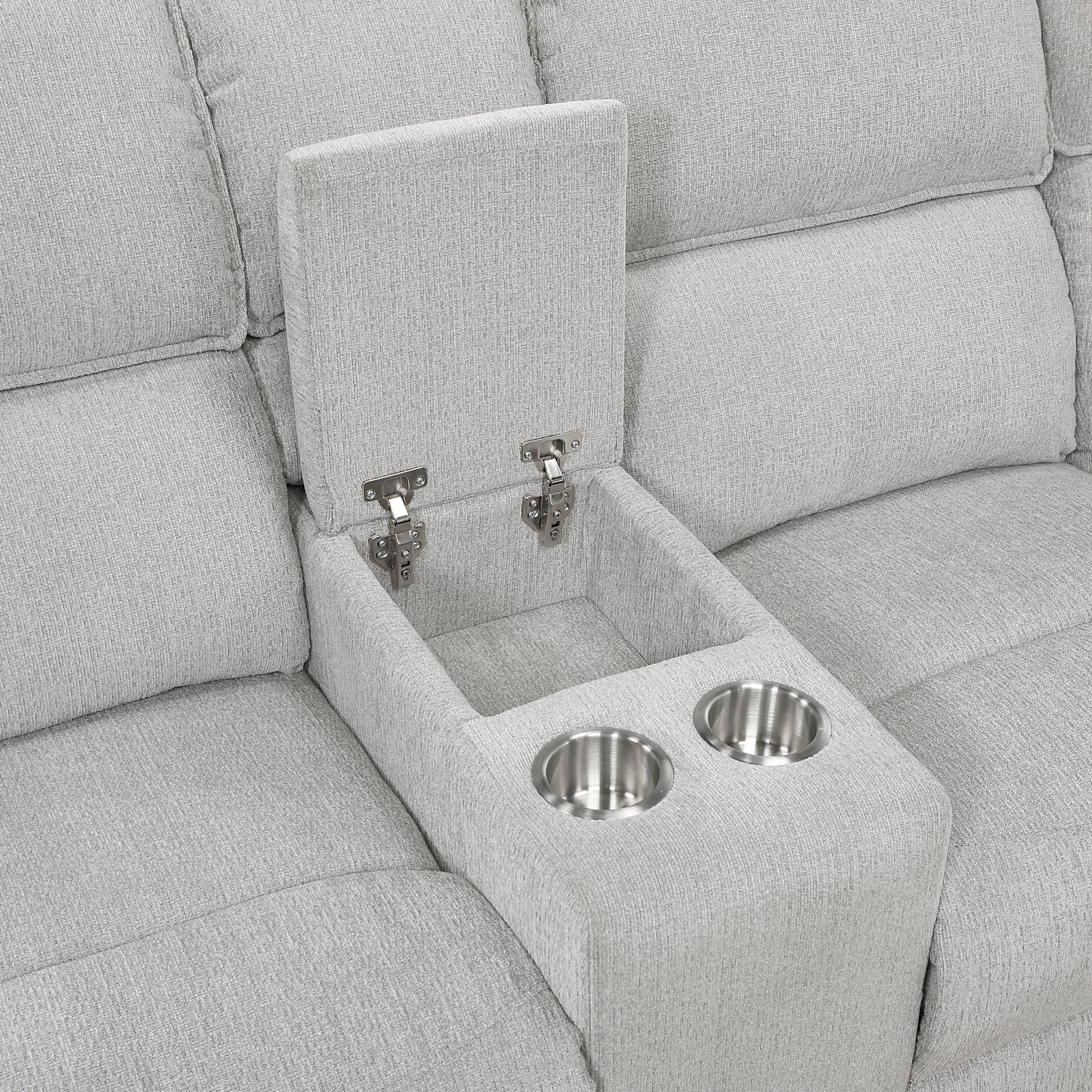 Sink into ultimate comfort and style with the reclining sectional with console, a three-piece centerpiece designed for luxurious lounging and effortless entertaining in your living space. This expansive sectional features plush chenille fabric upholstery that invites relaxation, while the power reclining mechanisms on both ends allow you to effortlessly find your perfect angle for unwinding after a long day. The convenient console nestled within the left-side facing loveseat offers two cup holders and hidden storage, keeping your essentials within easy reach. Built with a sturdy plywood frame featuring a metal-reinforced seat and supportive foam padding over pocket coils, this sectional promises lasting durability and exceptional comfort for you and your loved ones.