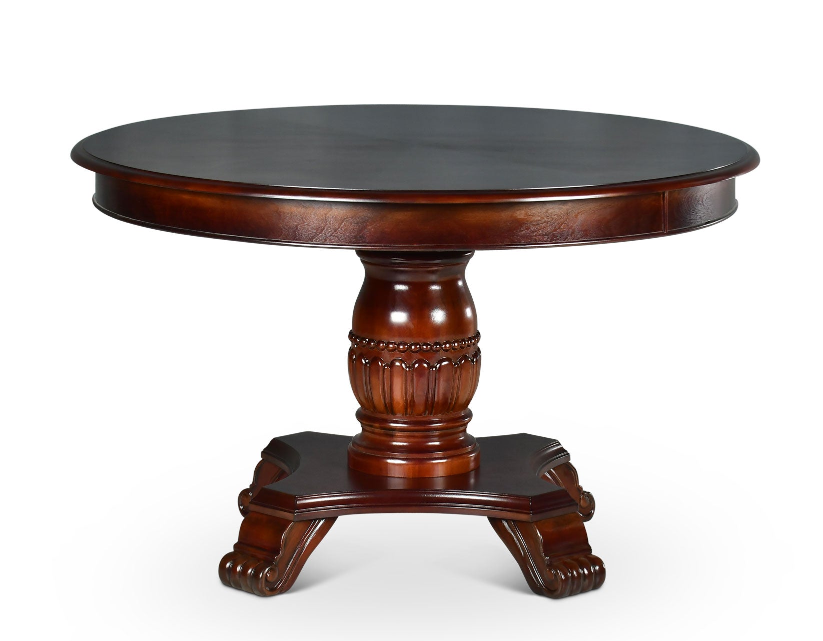 Enjoy both game night and dining nights with this dual-purpose dining and game table. The 48-inch round table comes in a medium cherry finish and can accommodate four comfortably for dining. The table easily converts to a game table with the addition of the game table-top that is available in brown faux-leather (as shown) or black faux-leather. The game top folds and stores easily and the table goes back to a dining table. The upholstered.faux-leather captain’s chair is castered for easy mobility and comes in a wide range of colors perfect for every decor.