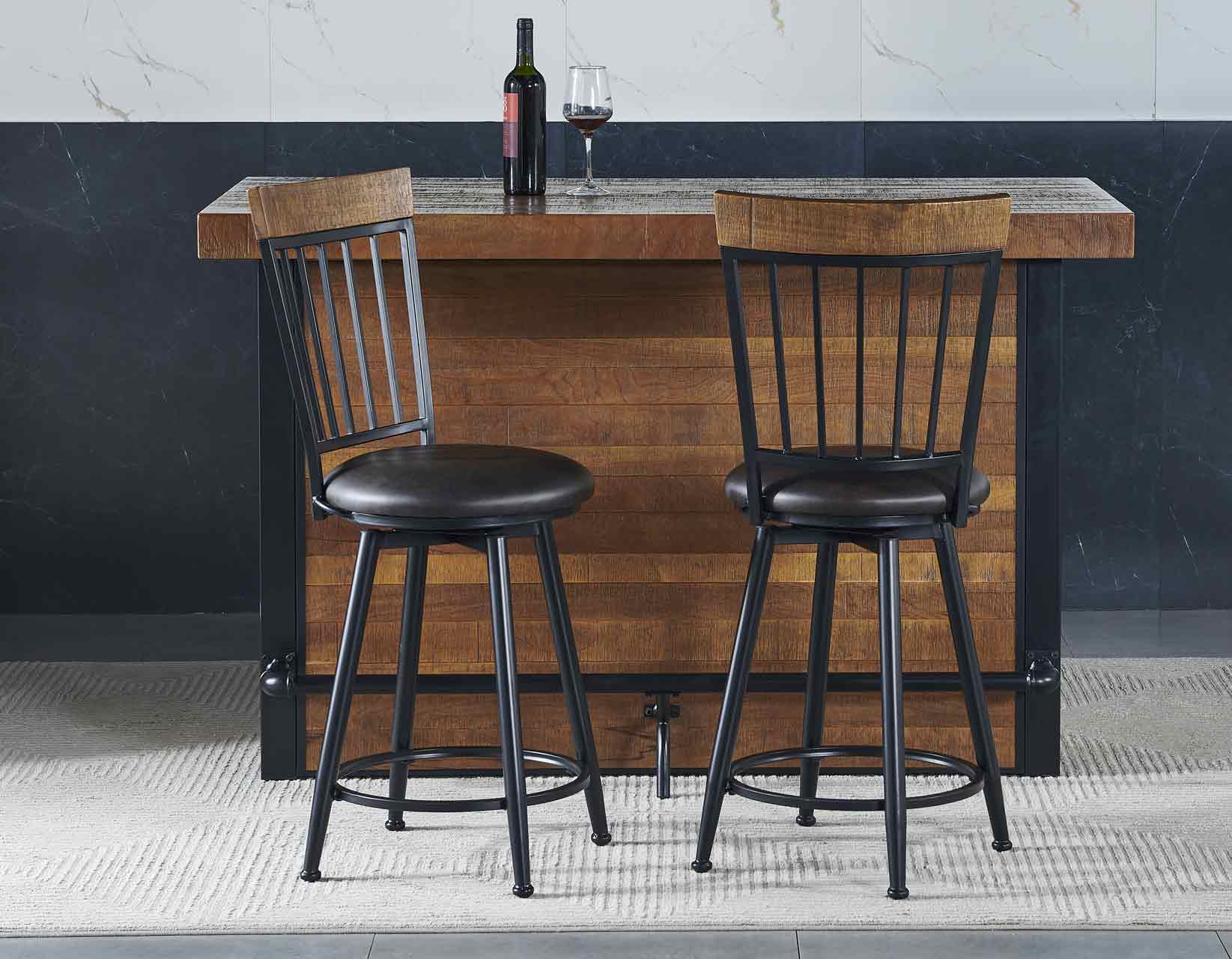Sturdy and rustic, the Tyler 38-inch Bar Table offers a slice of nostalgia in a Bar setting. Casual and relaxed, Tyler has a great look with a warm Chestnut finish over a timber-beam base with powder-coated black accent and footrail. The back of the Bar offers everything needed for serving one or a crowd: a hanging stemware holder for storing glasses and a fixed shelf for ample room to store all the bottles needed. Organized and stylish, Tyler gives you both.