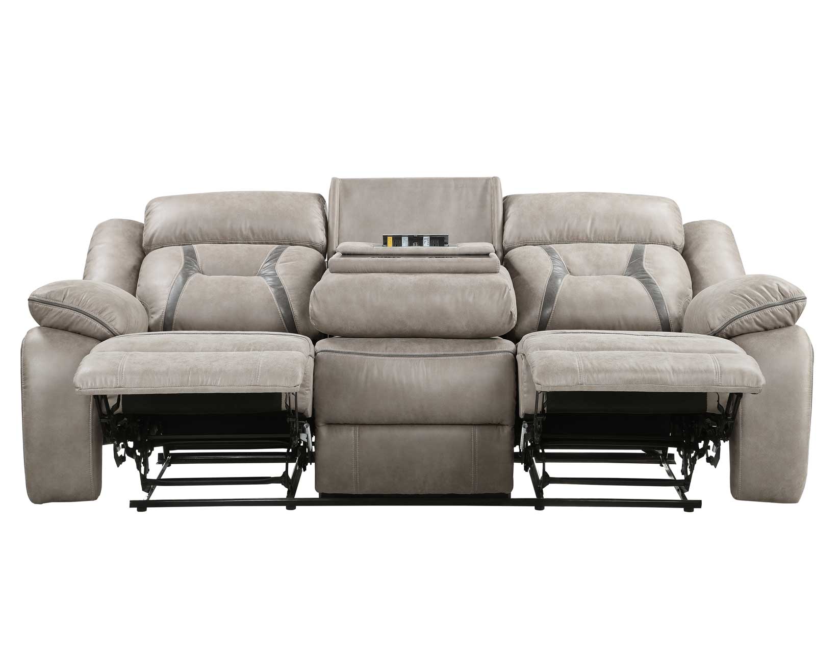 An 86″ long feature-packed comfort excursion, the Tyson manual reclining sofa checks off all the boxes for a living room. A Drop-down center console adds two cupholders, two electrical outlets and two USB charging ports and makes it the center of the action. The console lifts out of the way and adds an extra seat when guests arrive. The gray leatherette cleans simply with the wipe of a damp cloth and is breathable for added comfort.
